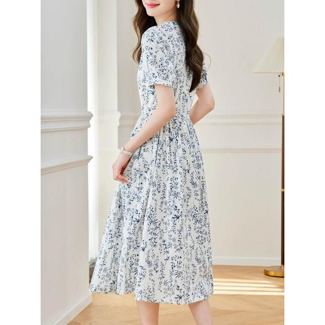 2025夏季新款裙子國風印花青花瓷高腰裙新中式連衣裙女中長款