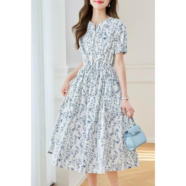 2025夏季新款裙子國風印花青花瓷高腰裙新中式連衣裙女中長款