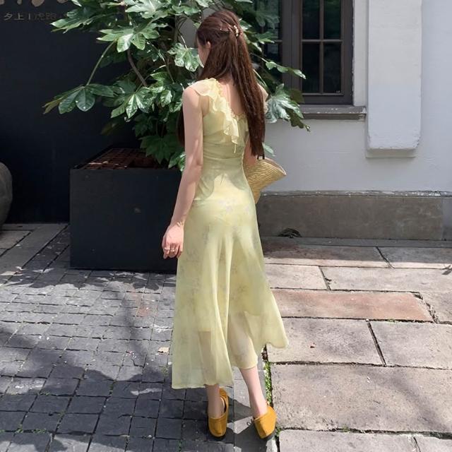 2026夏季新款法式收腰連衣裙女氣質顯瘦長款黃綠色溫柔風度假長裙