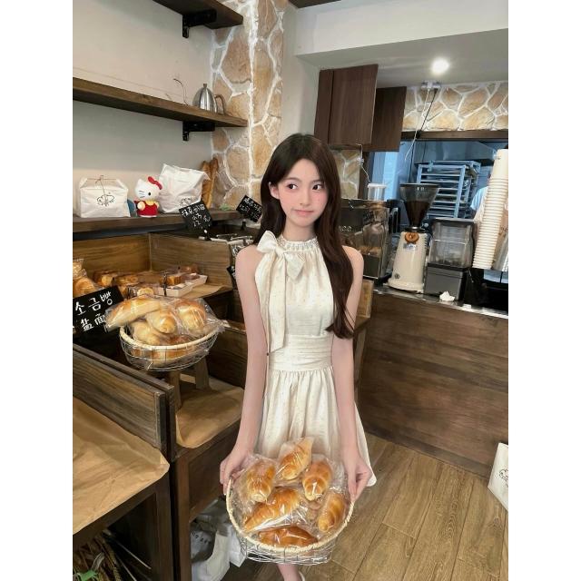 富家千金風燙鉆蝴蝶結掛脖連衣裙女春季高級感氣質收腰A字女裙子