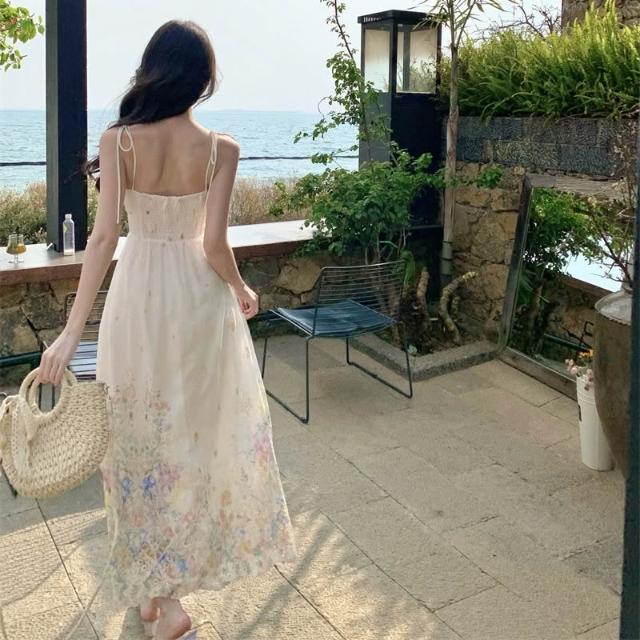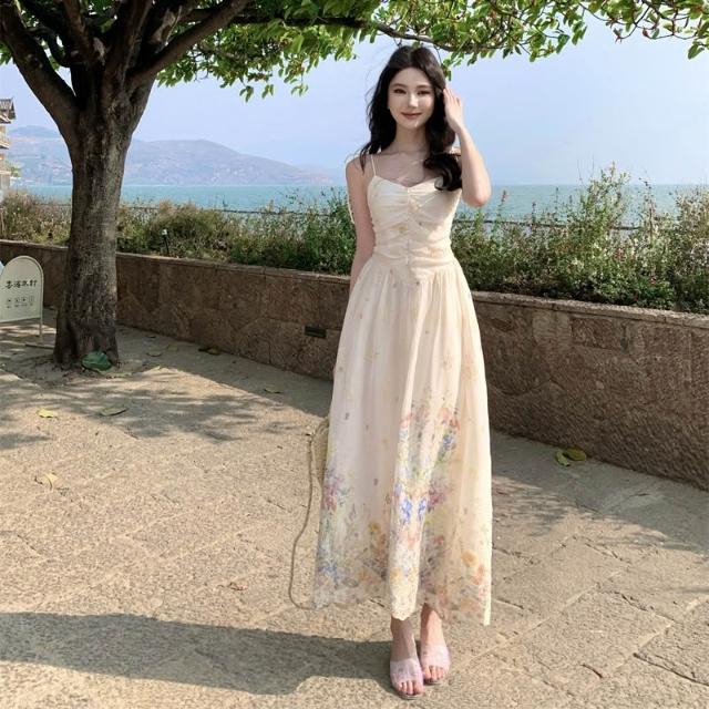法式田園清新刺繡提花碎花V領重工吊帶連衣裙女夏季收腰顯瘦長裙