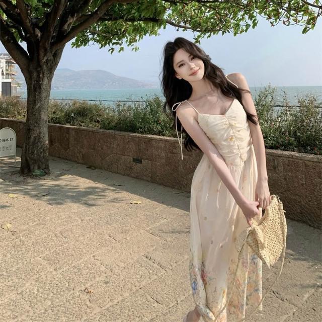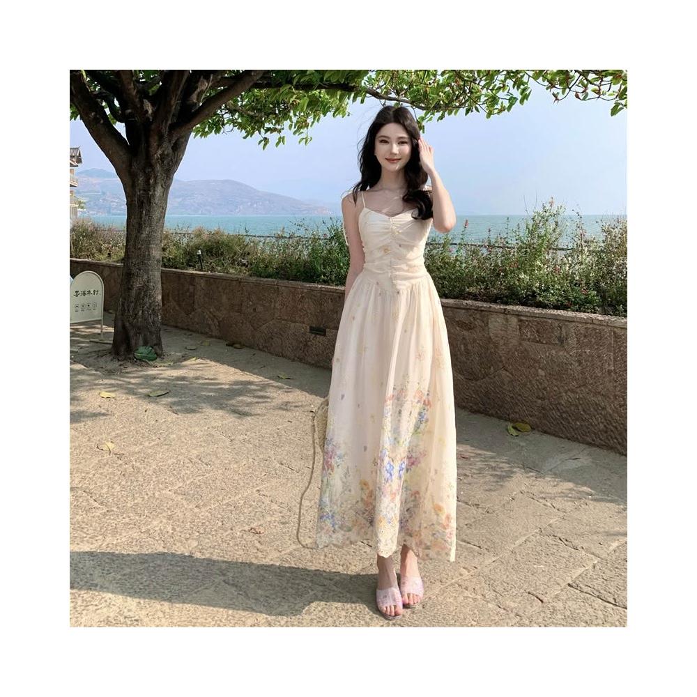 法式田園清新刺繡提花碎花V領重工吊帶連衣裙女夏季收腰顯瘦長裙