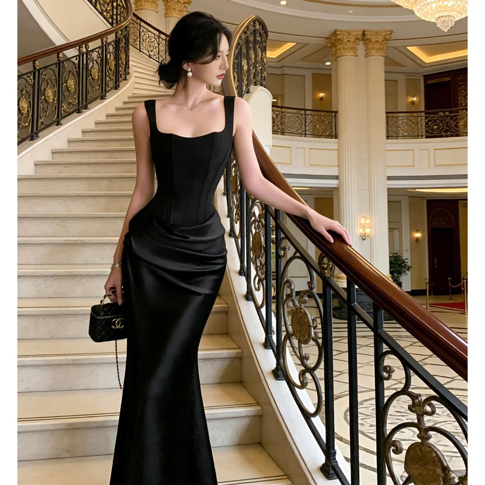 實拍 法式黑色吊帶魚骨連衣裙女方領氣質收腰緞面性感禮服裙子