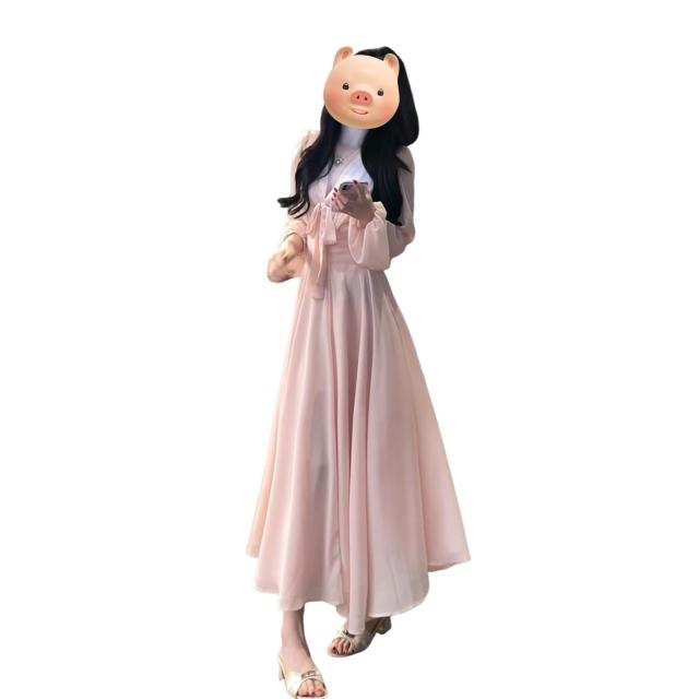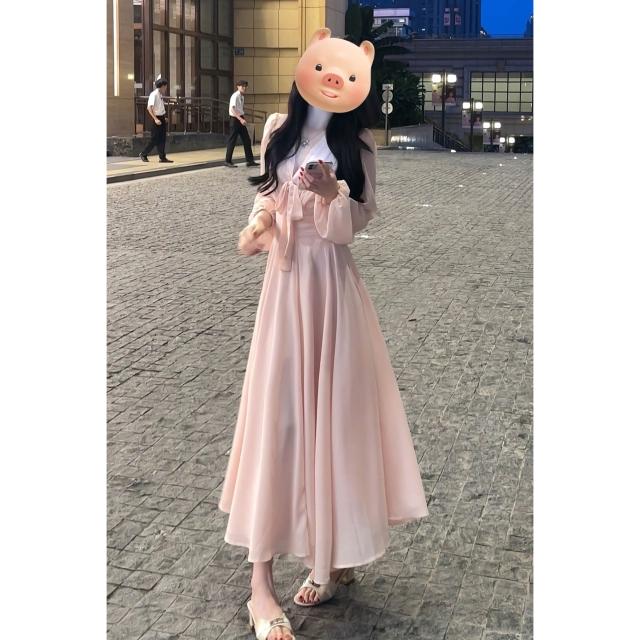 法式粉色溫柔V領千金風長袖連衣裙子女2025新款早秋女裝仙女長裙