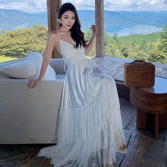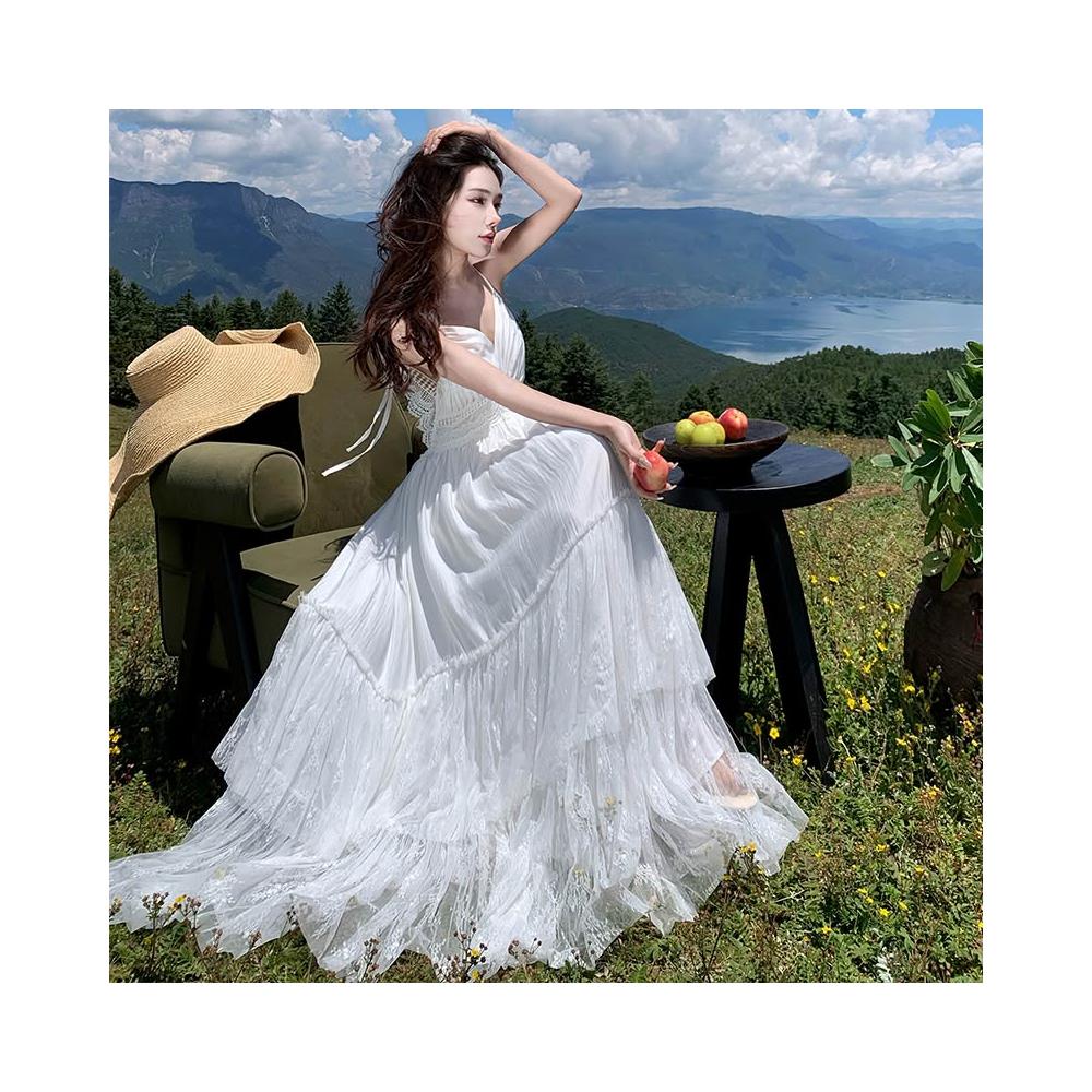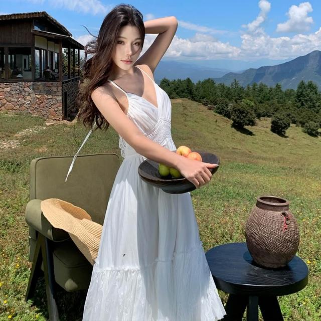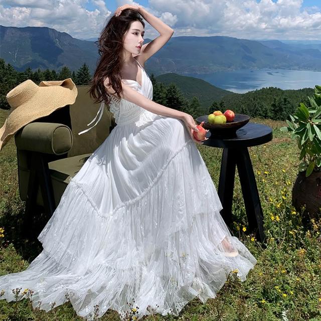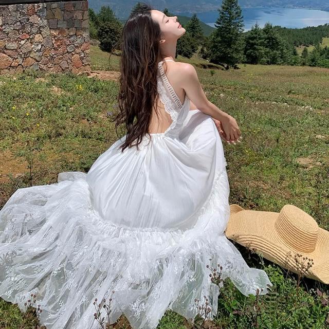 旅拍波西米亞度假白色蕾絲拼接露背大擺連衣裙度假長裙