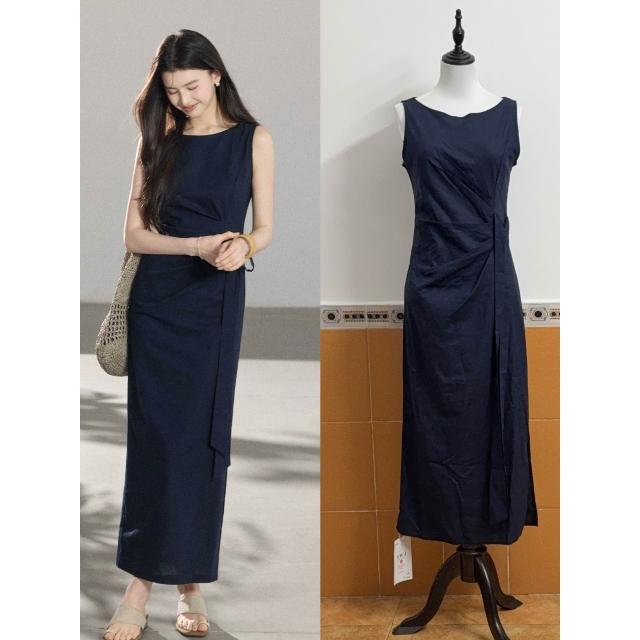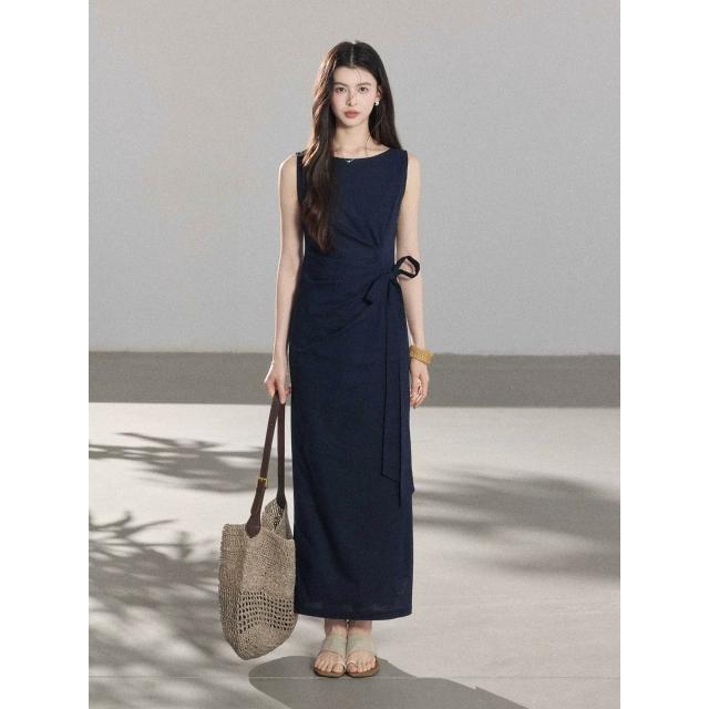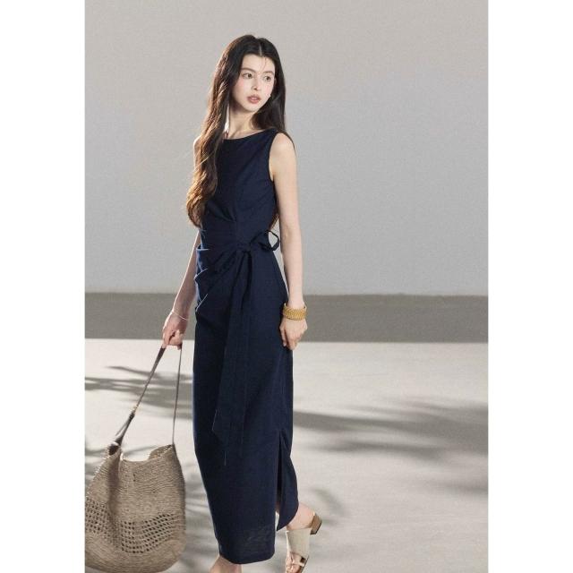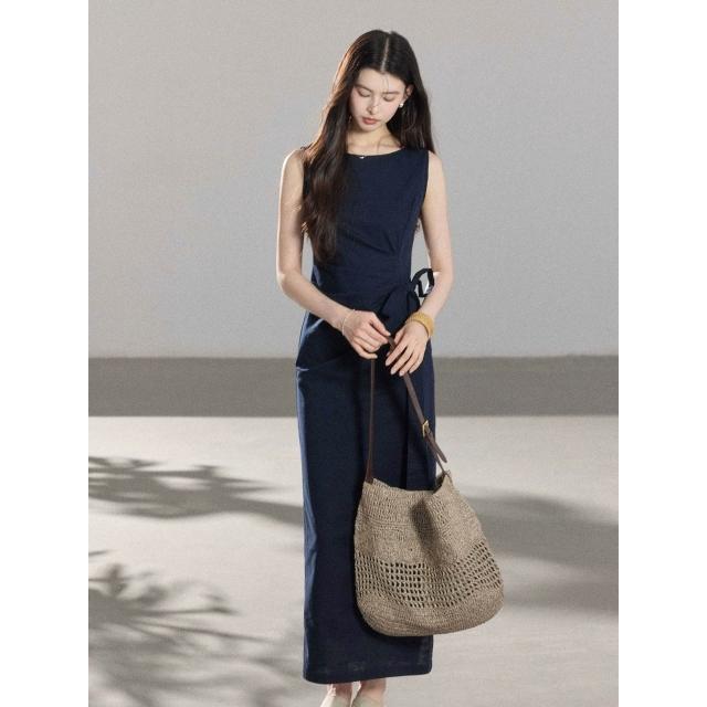 沐青高級感氣質收腰系帶連衣裙女棉麻通勤百搭背心裙