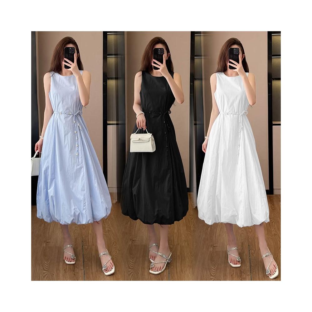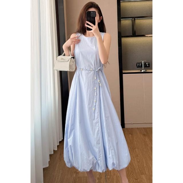 韓版白色無袖花苞串珠腰帶連衣裙女2026新款夏季甜美氣質顯瘦長裙