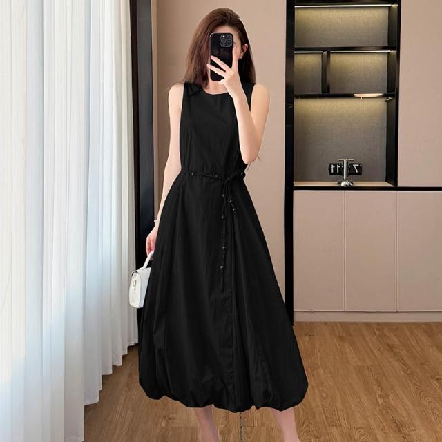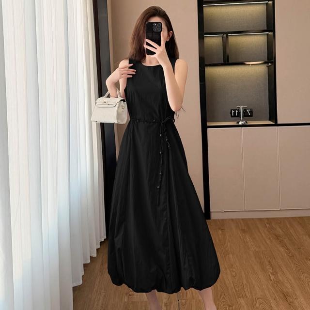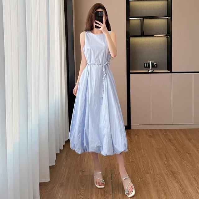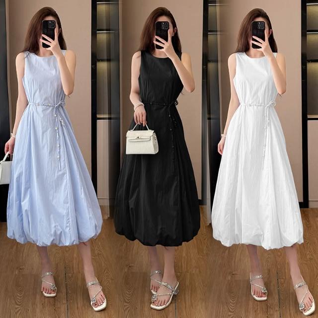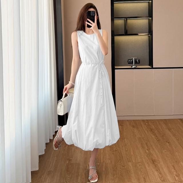 韓版白色無袖花苞串珠腰帶連衣裙女2026新款夏季甜美氣質顯瘦長裙