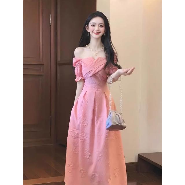 有貨法式溫柔粉色連衣裙女夏季多巴胺獨特漂亮一字肩中長裙子