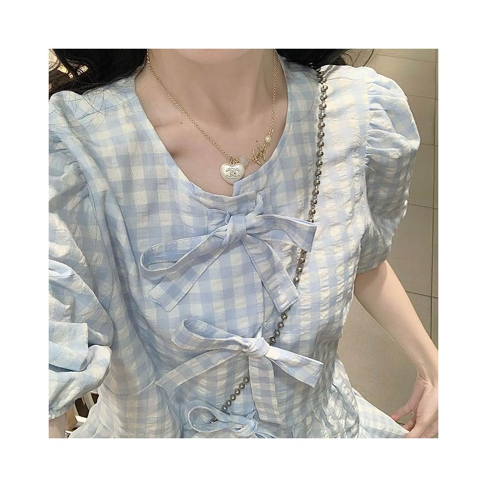免運 實拍"法式甜美風藍白格休閒襯衫半身裙套裝