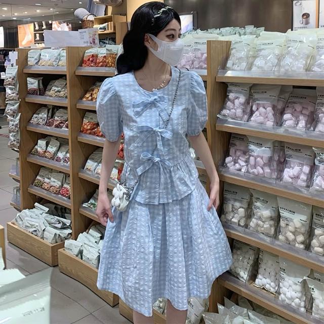 免運 實拍"法式甜美風藍白格休閒襯衫半身裙套裝