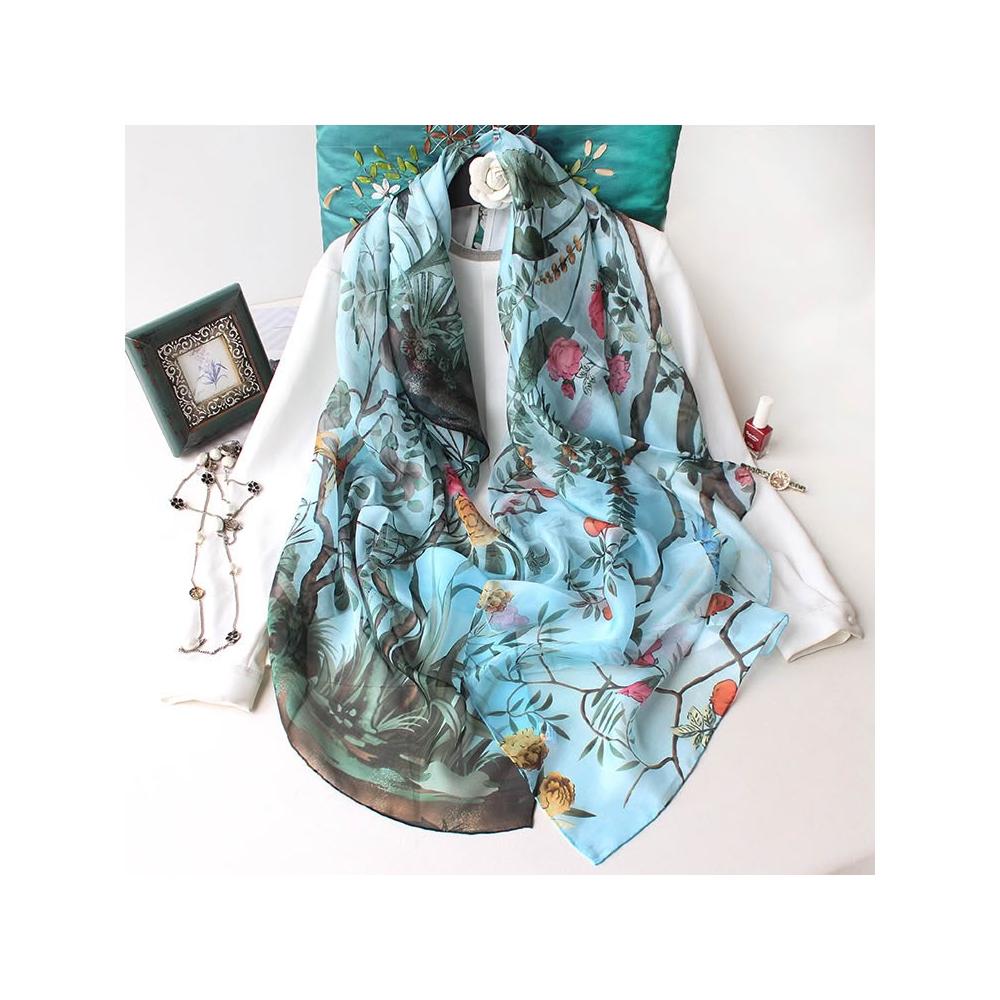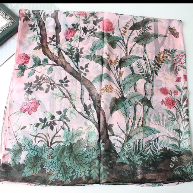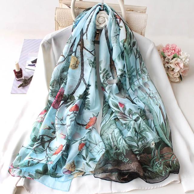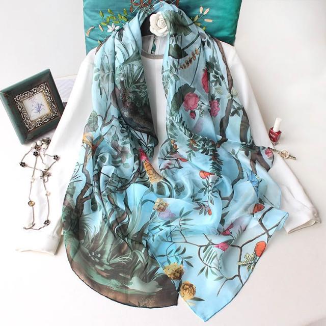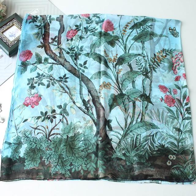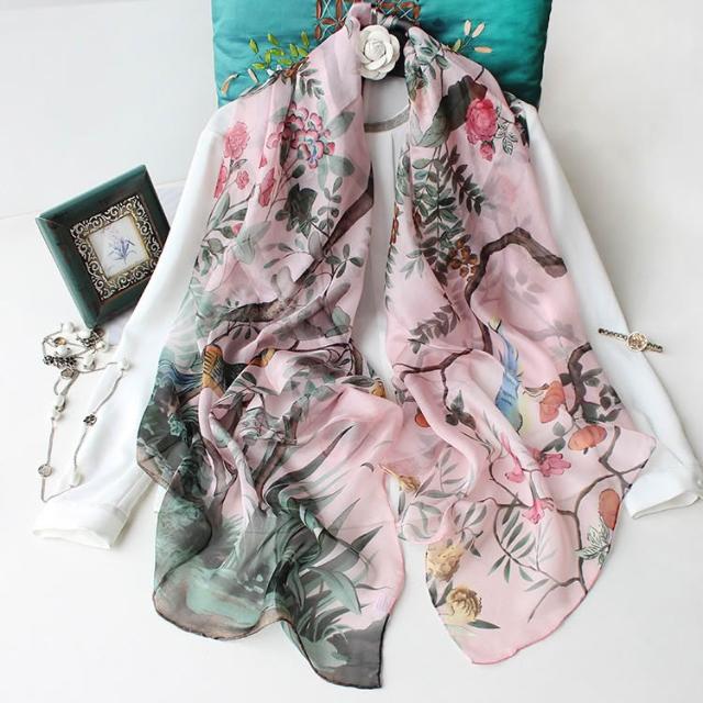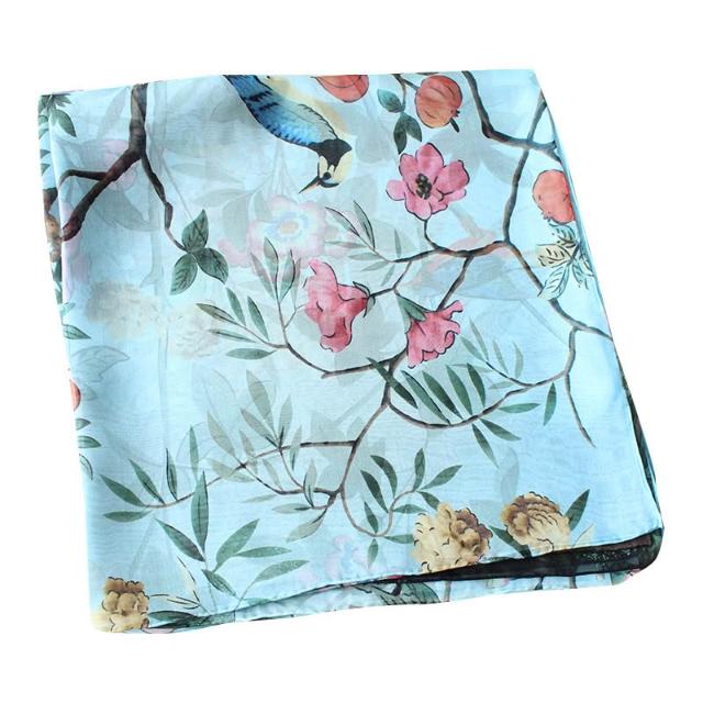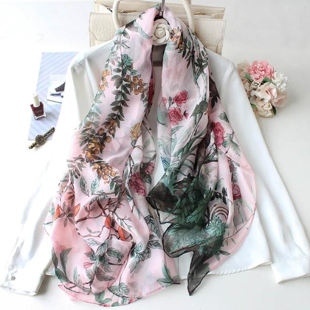 免運 鳥語花香真絲雪紡桑蠶絲大方巾手工卷邊兩用沙灘大絲巾女士專用