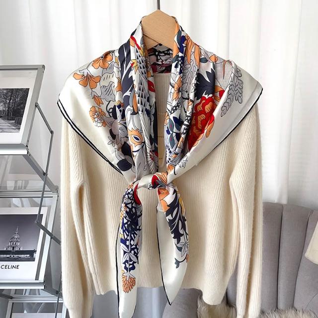 免運 真絲花卉手卷邊110cm大方巾優雅女士桑蠶絲披肩時尚外搭圍巾