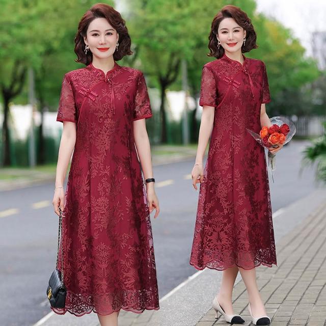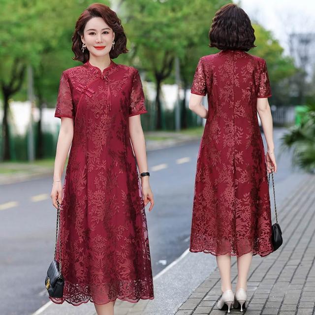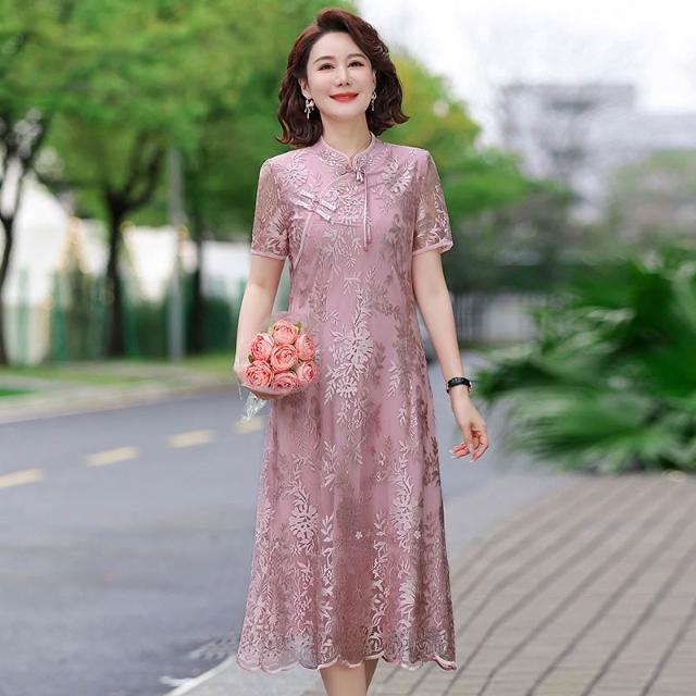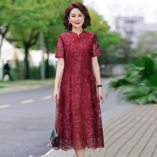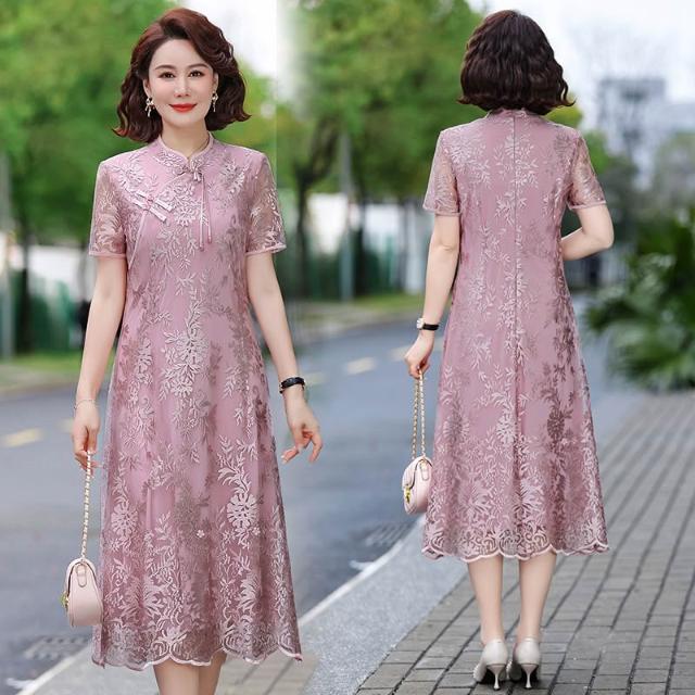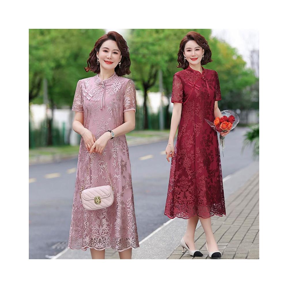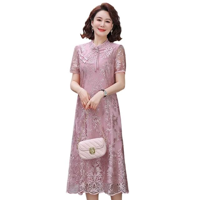 免運 媽媽夏裝連衣裙短袖蕾絲裙時尚旗袍裙中長款直筒裙過膝裙大碼寬鬆
