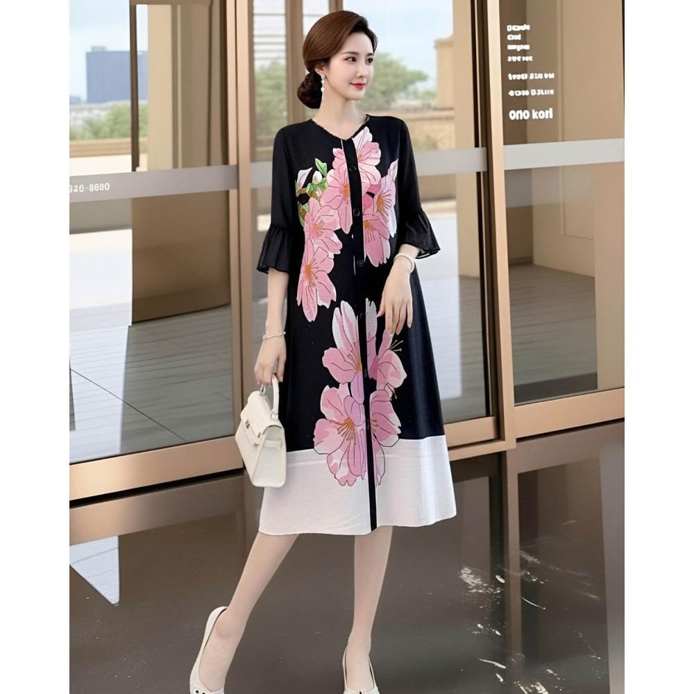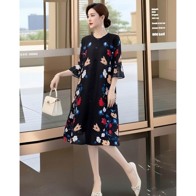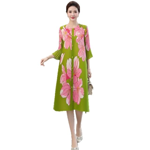 免運 復古印花連衣裙女夏季綠色彈簧裙三宅風褶皺海邊度假大碼媽媽裙子