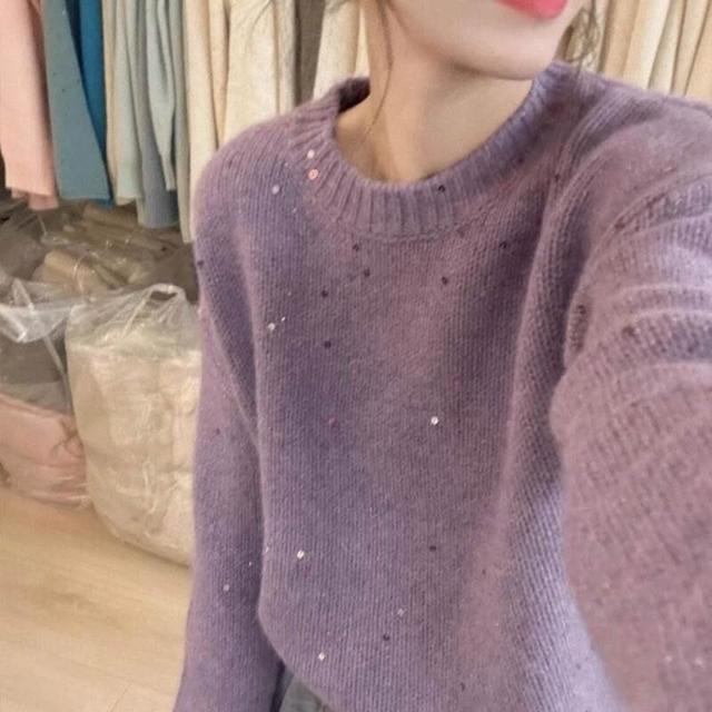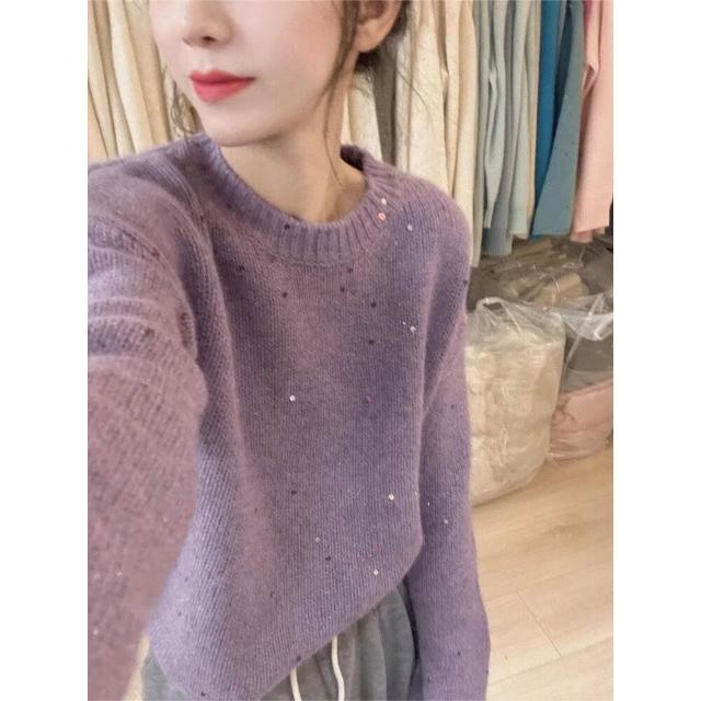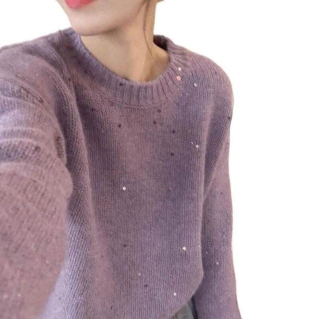 希妍 溫柔風軟糯紫色亮片毛衣女秋冬奶fufu慵懶外穿套頭針織上衣