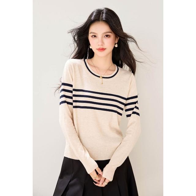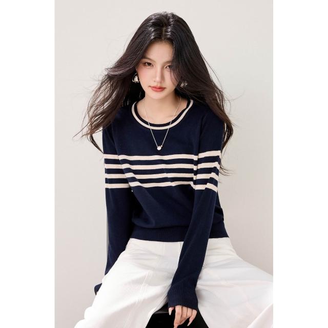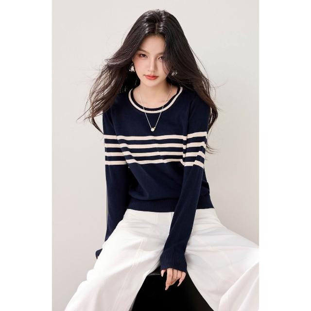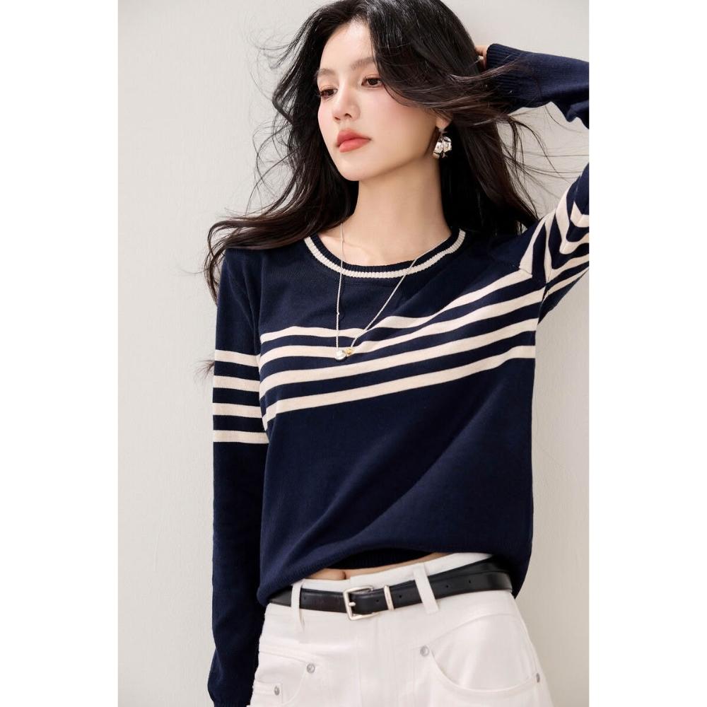 希妍 實拍秋季新款針織衫女套頭條紋長袖學院風圓領短款韓版針織毛衣女