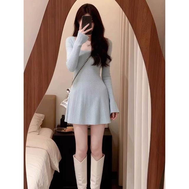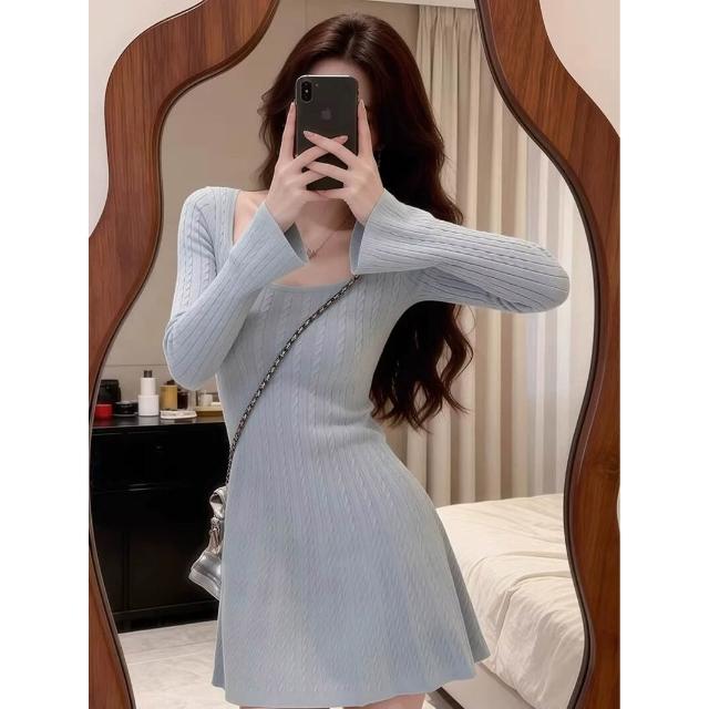 希妍 法式修身長袖麻花針織連衣裙子女收腰氣質內搭A字毛衣短裙秋冬季