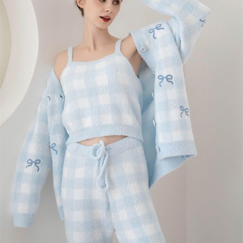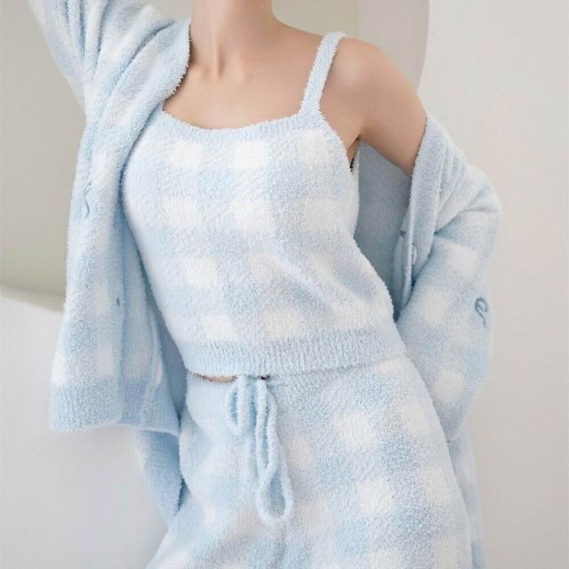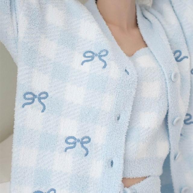 希妍 韓式甜美v領顯瘦吊帶開衫三件套半邊絨保暖外穿睡衣睡褲女士套裝