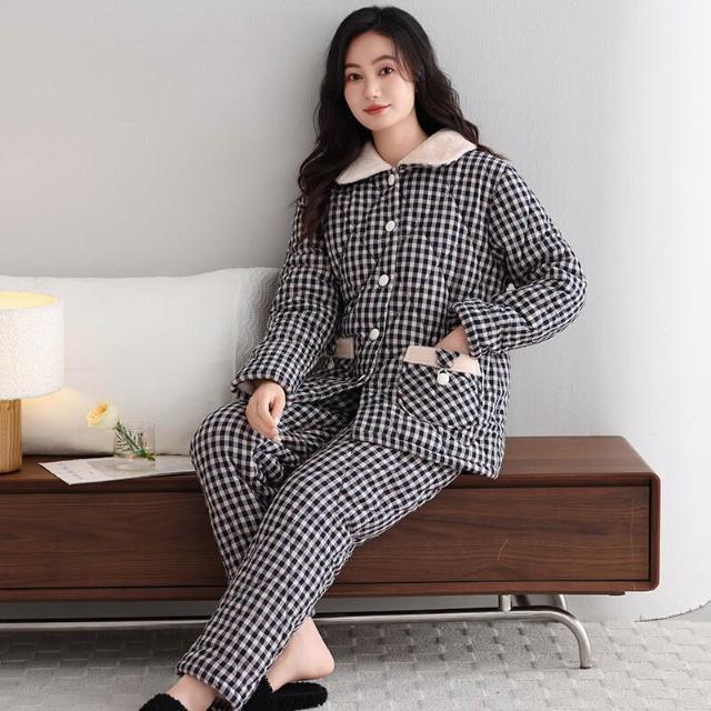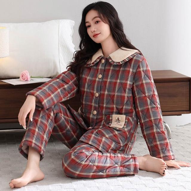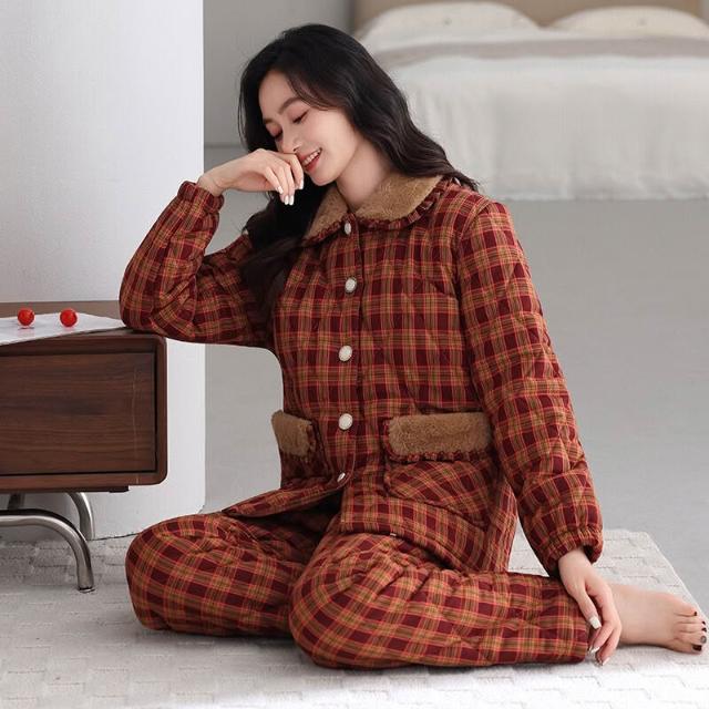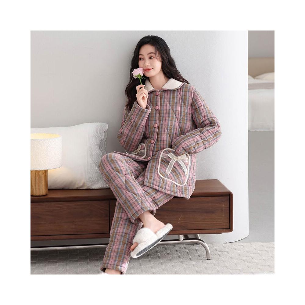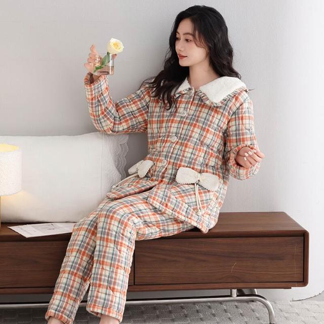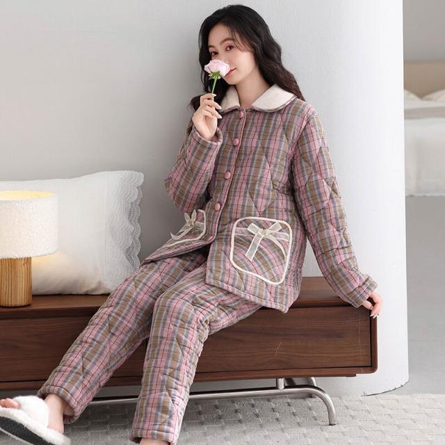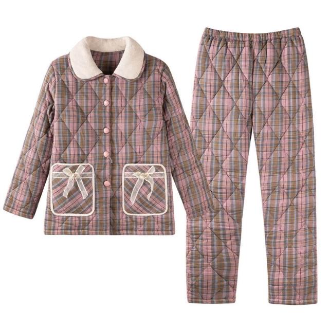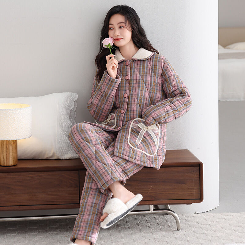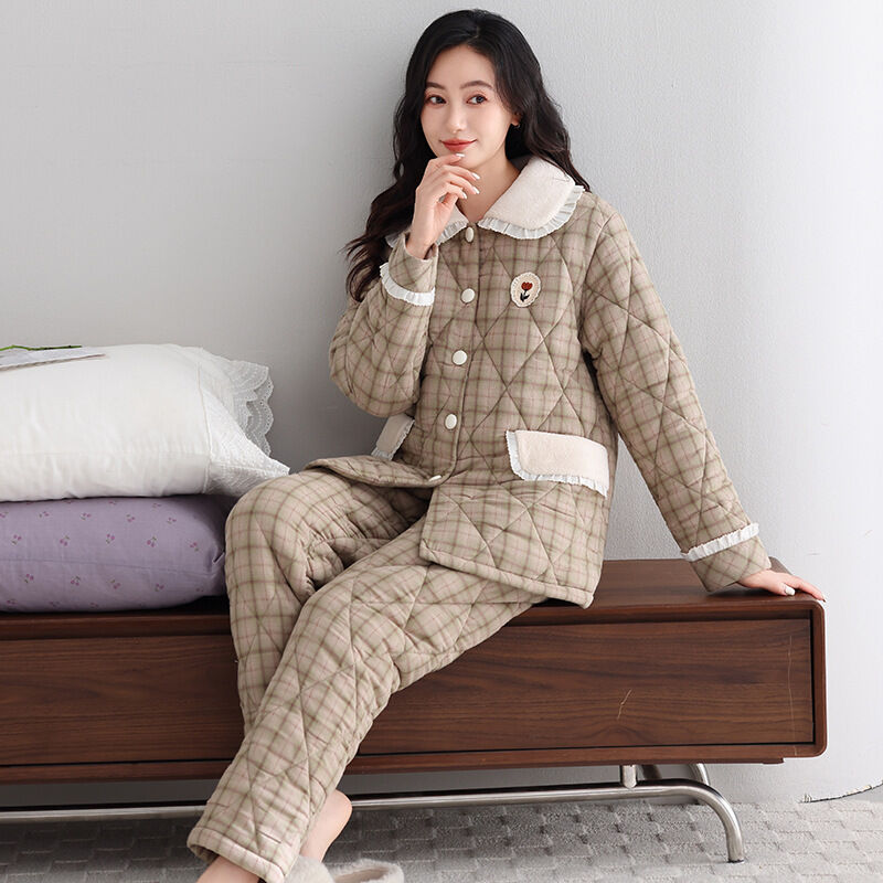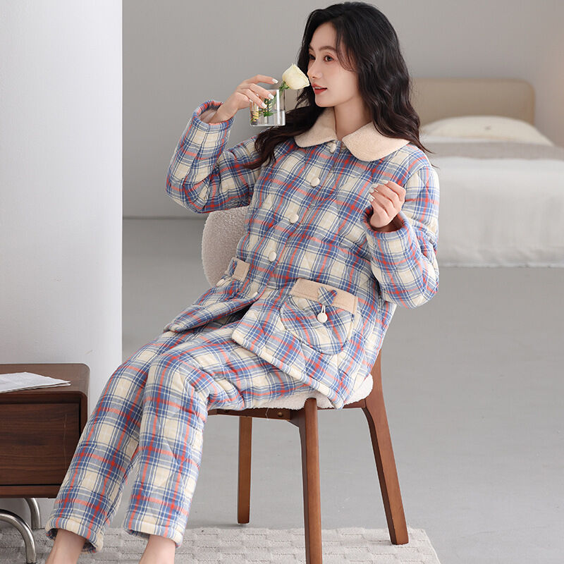 希妍 睡衣女冬季純棉夾棉三層加厚女士珊瑚絨加絨保暖秋冬款家居服套裝