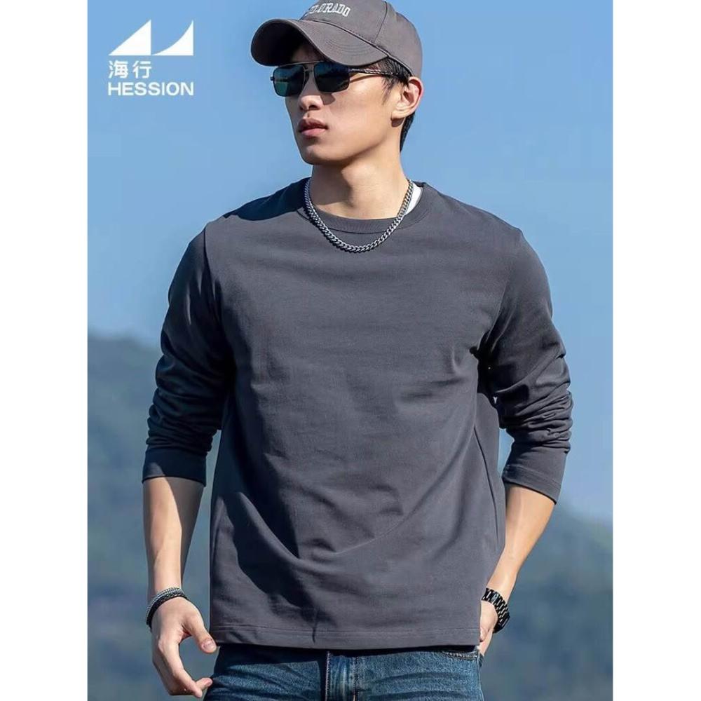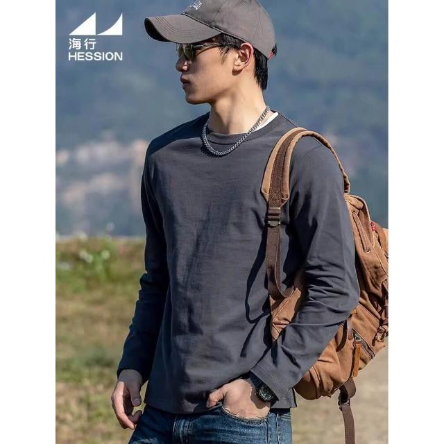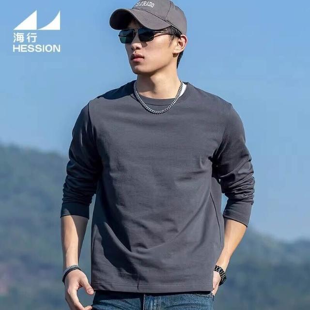 希妍 海行灰色300g重磅純棉長袖t恤男 2026新款春季正肩圓領打底衫