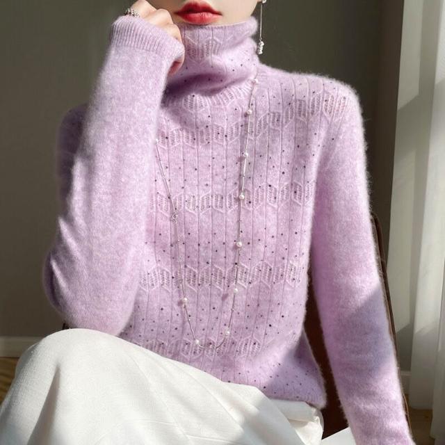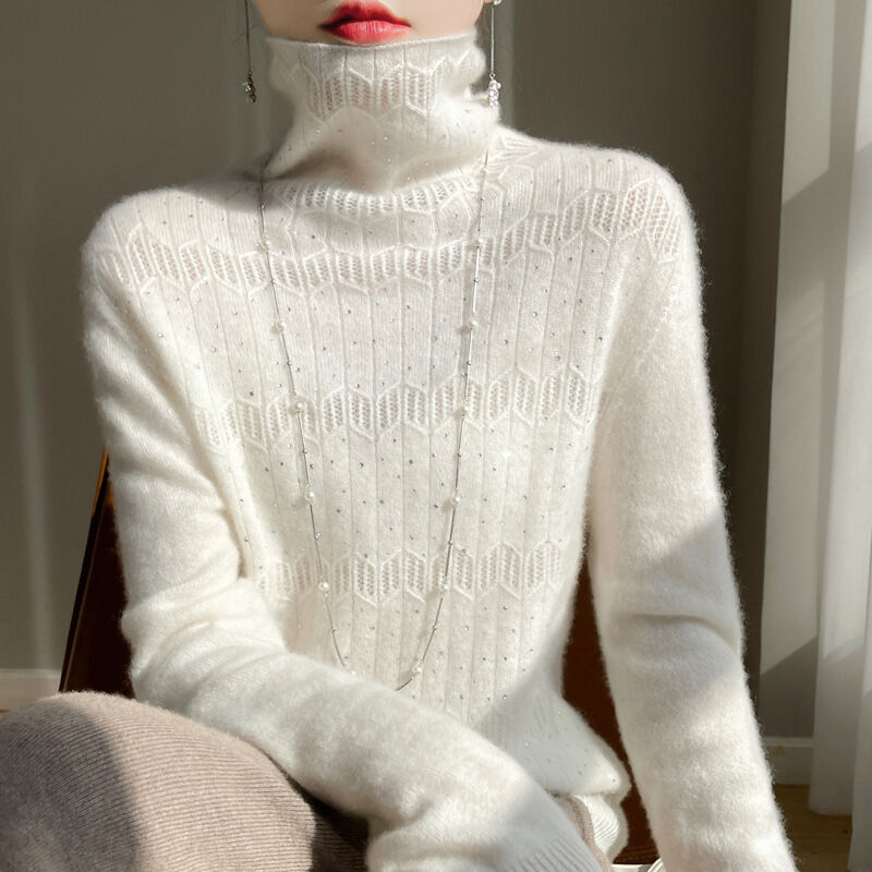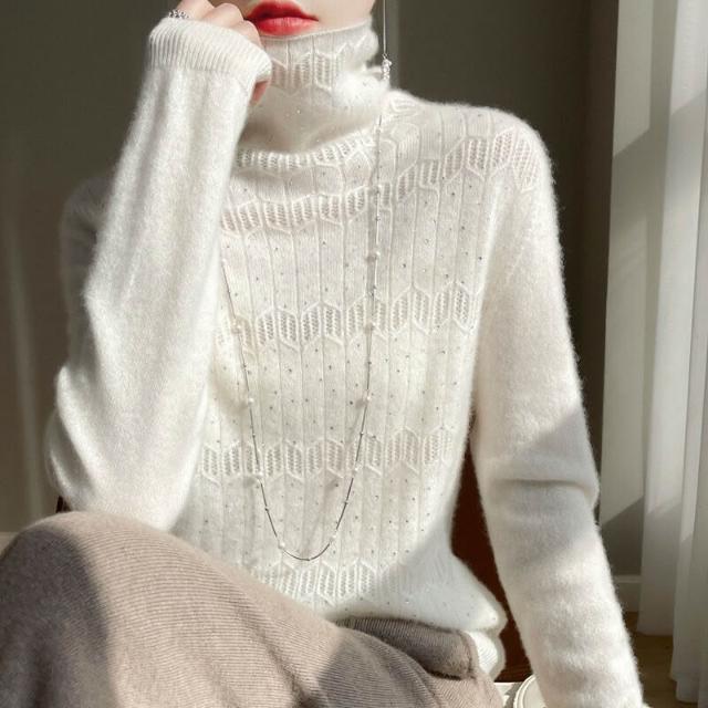 秋冬季高領一線成衣羊毛衫女镂空燙鉆堆堆領針織打底羊絨衫內搭