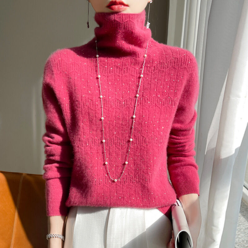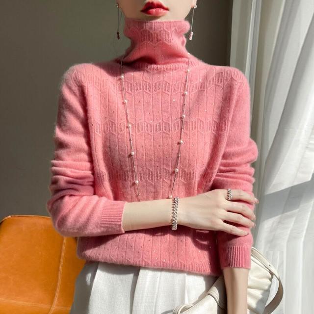 希妍 秋冬季高領一線成衣羊毛衫女镂空燙鉆堆堆領針織打底羊絨衫內搭