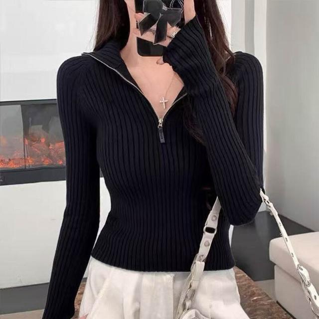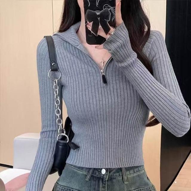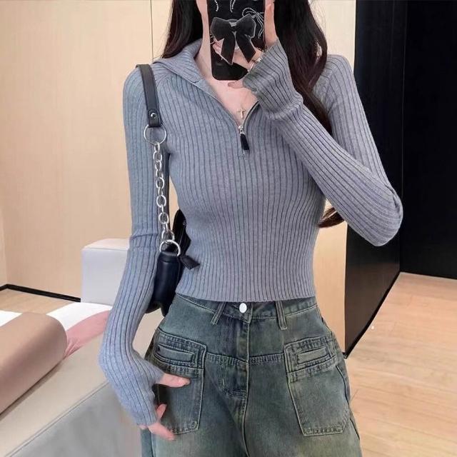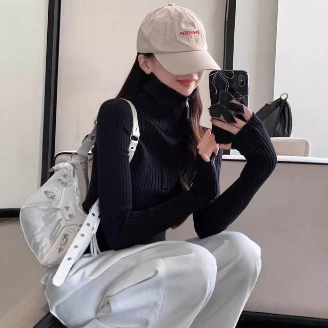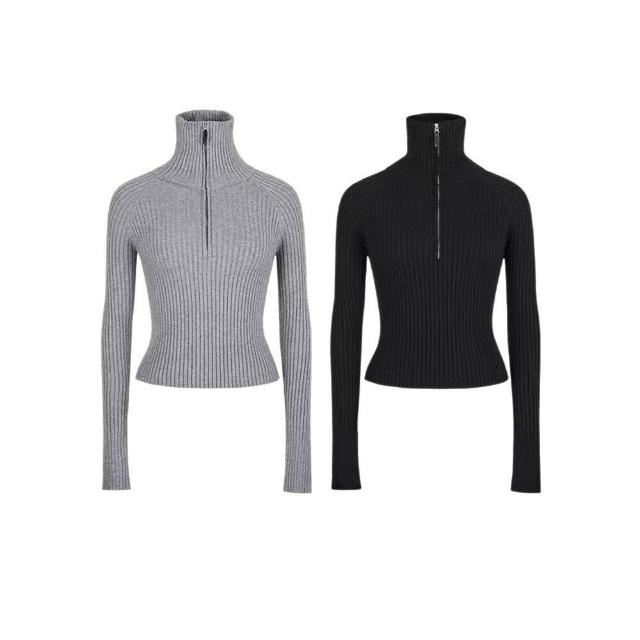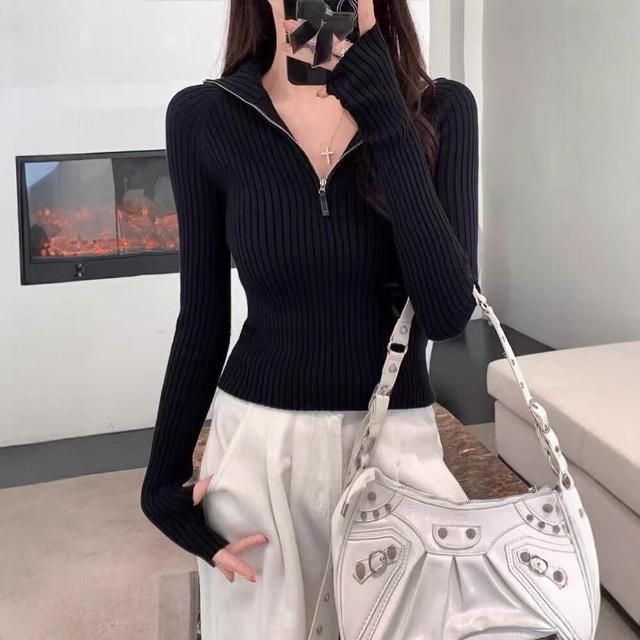 希妍 半拉鏈立領針織上衣女短款修身顯瘦羊毛衫小眾設計感高級毛衣打底