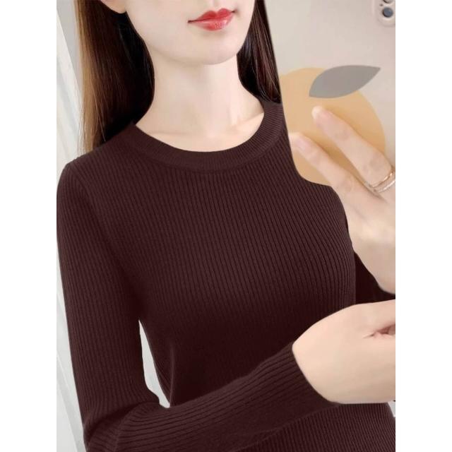 酒紅色長袖針織衫2025秋冬季新款圓領毛衣修身顯瘦內搭打底上衣女
