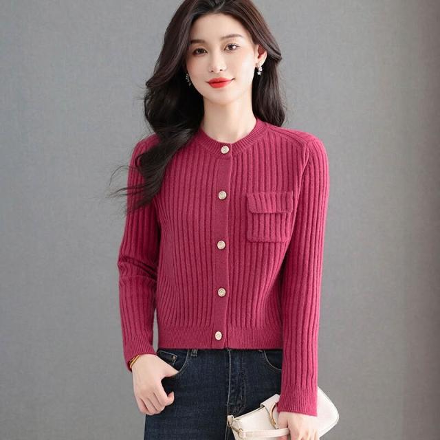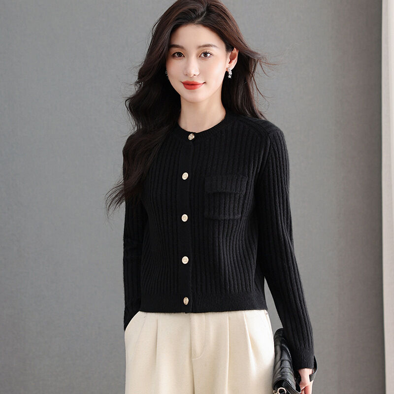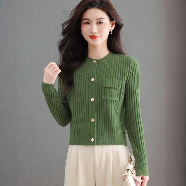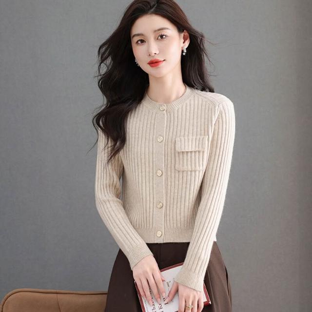 極簡風羊毛開衫女士圓領針織衫短款毛衣外套修身別致上衣