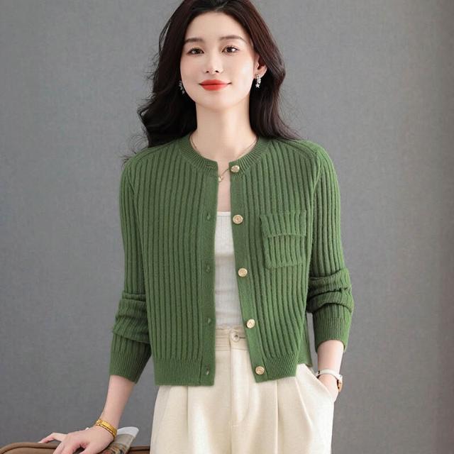 極簡風羊毛開衫女士圓領針織衫短款毛衣外套修身別致上衣