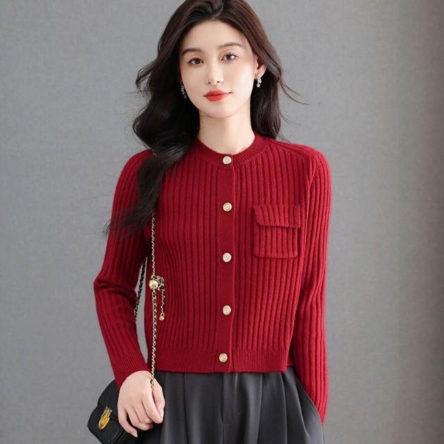 極簡風羊毛開衫女士圓領針織衫短款毛衣外套修身別致上衣