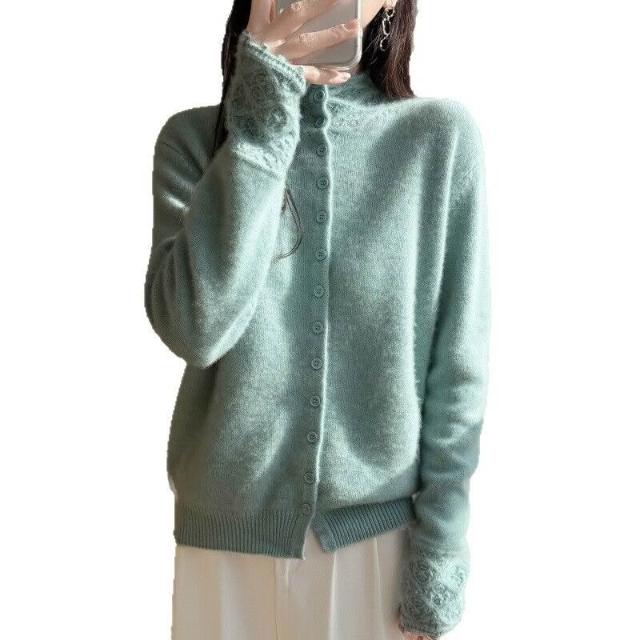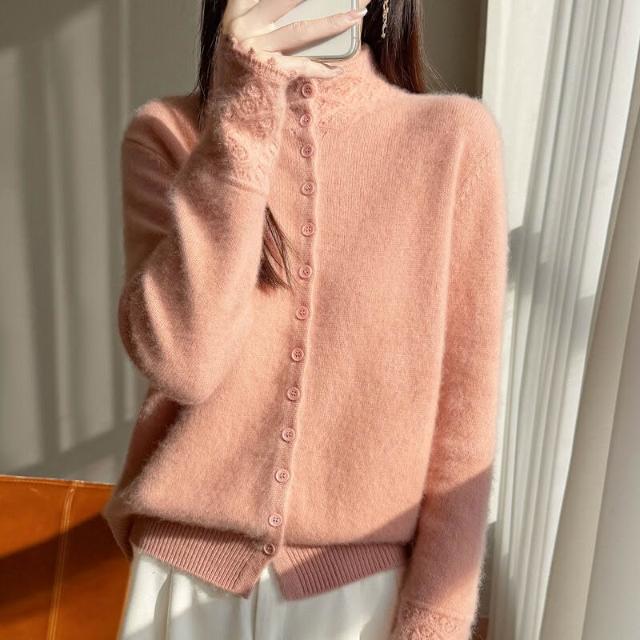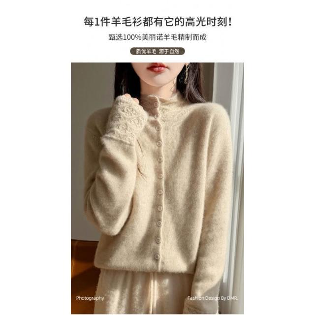 100純羊毛開衫女半高領鉤花針織上衣厚款羊絨毛衣秋冬女裝外套新