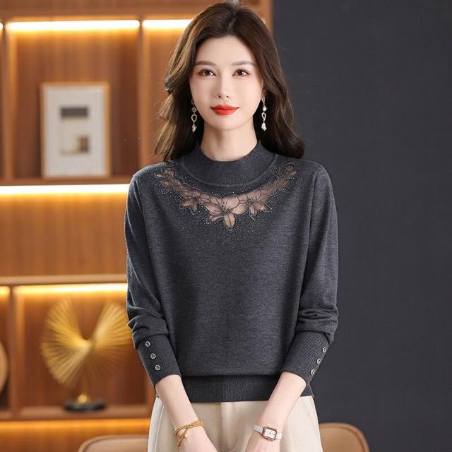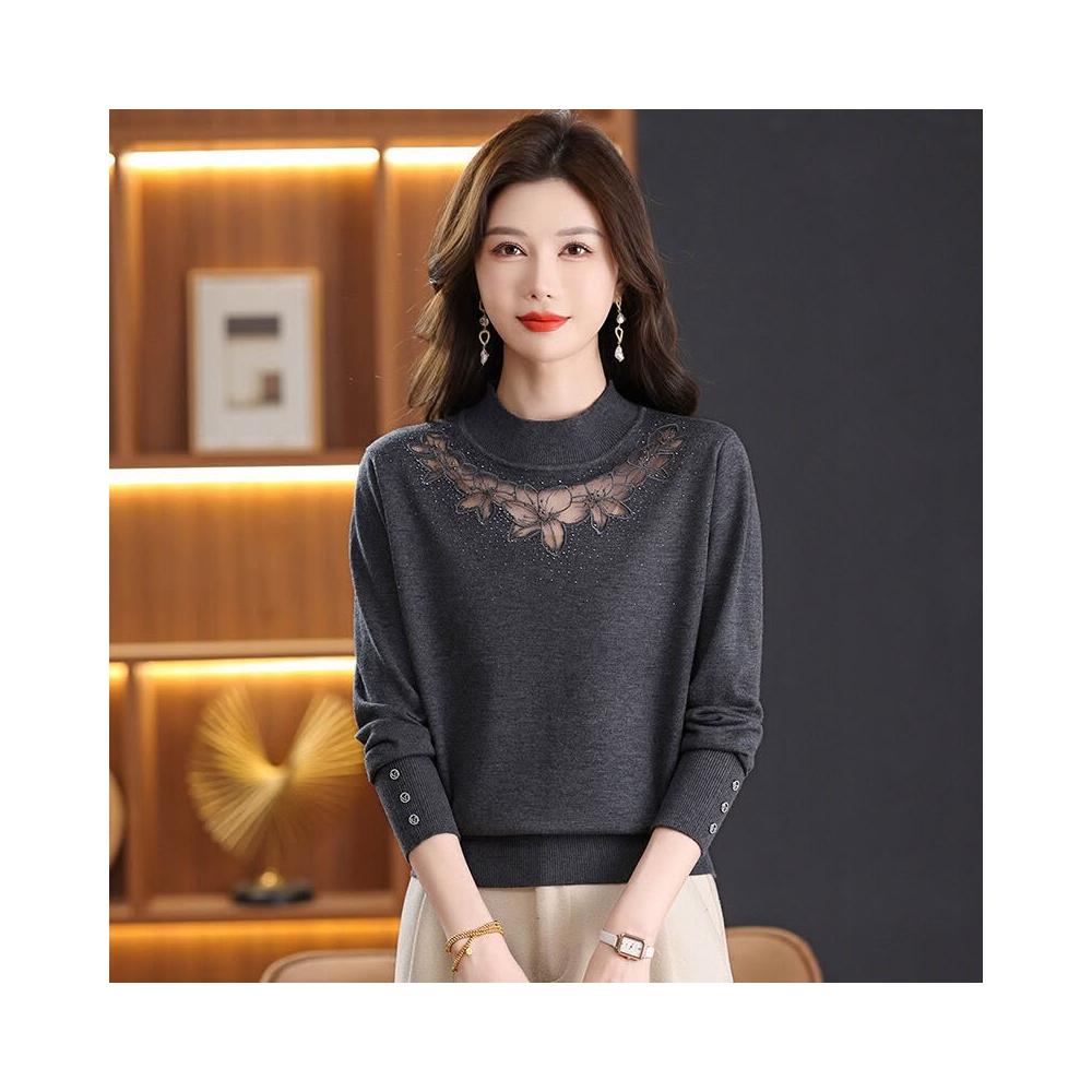希妍 蕾絲拼接镂空含羊毛針織衫女2025秋冬內搭打底衫時尚媽媽裝上衣