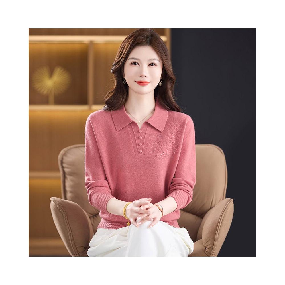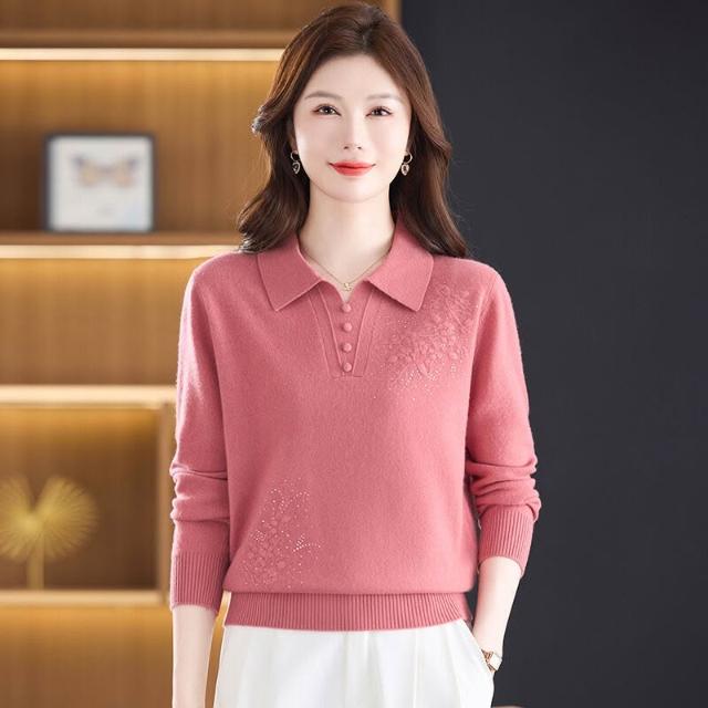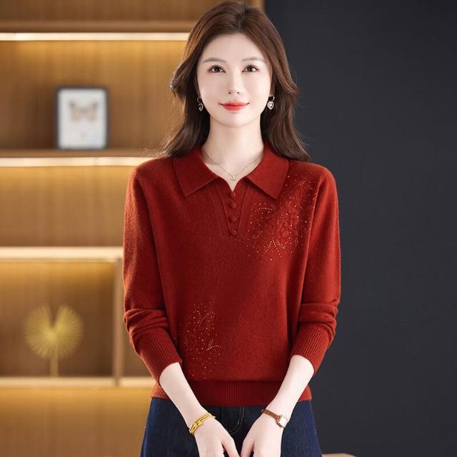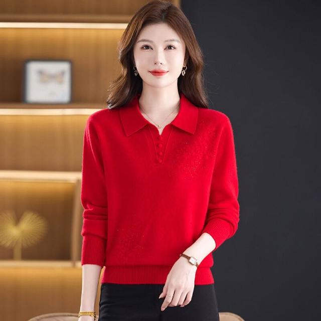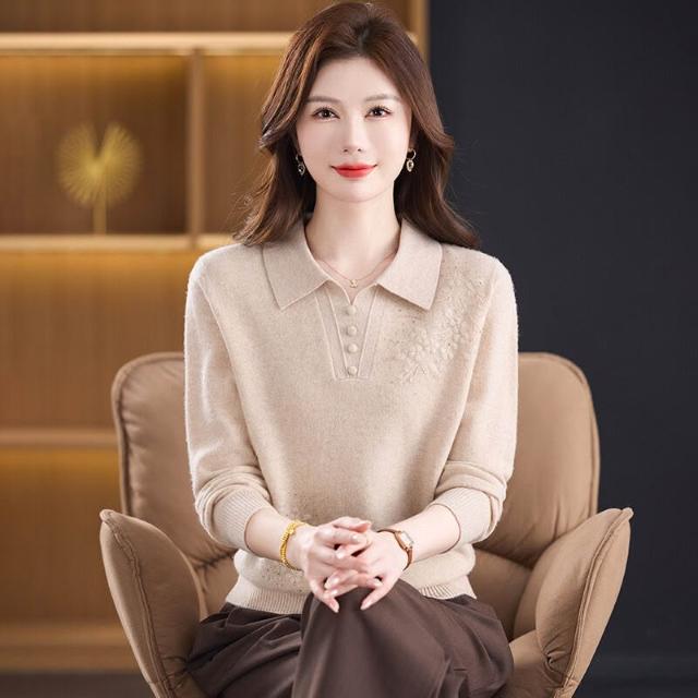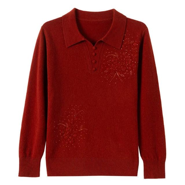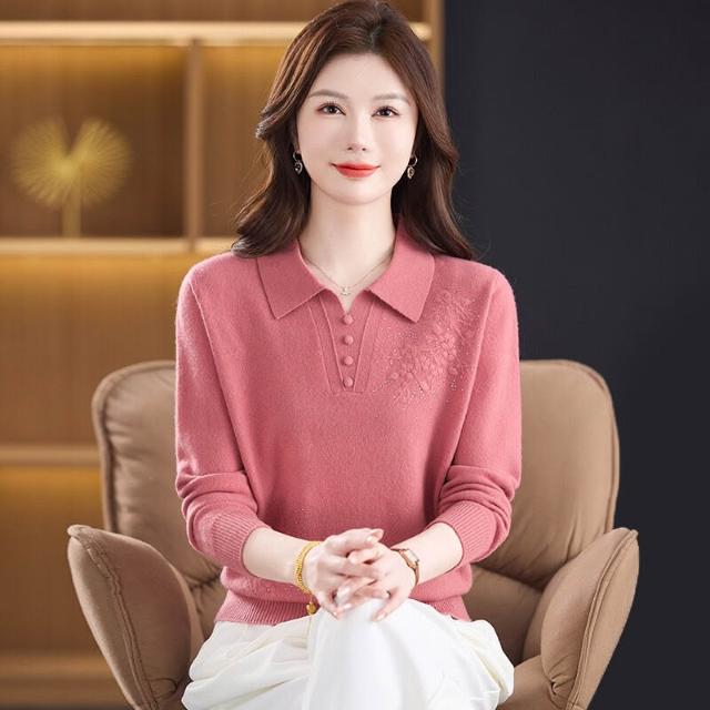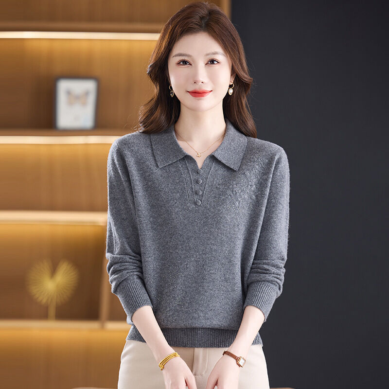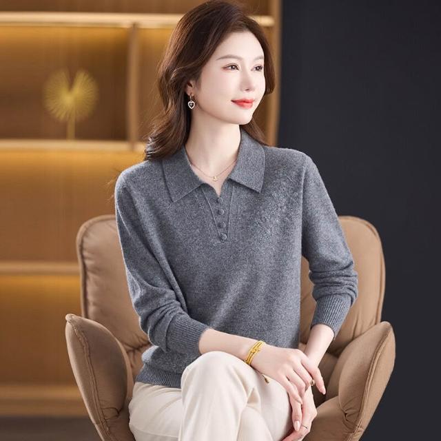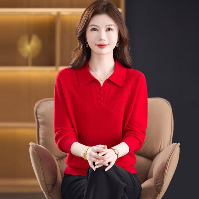 希妍 100%純羊毛衫媽媽裝秋冬毛衣薄款中年人女洋氣上衣翻領新款打底衫