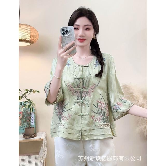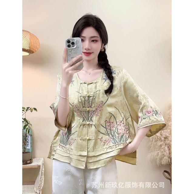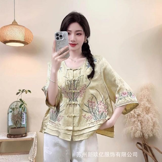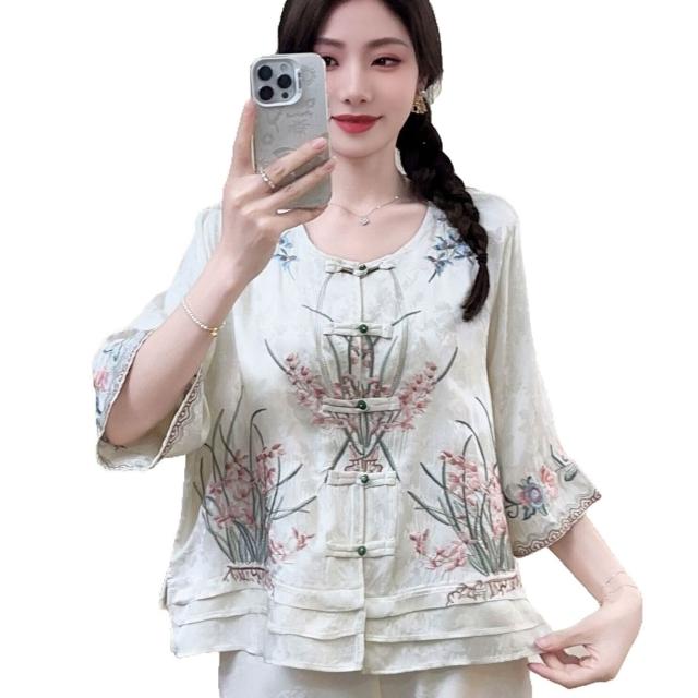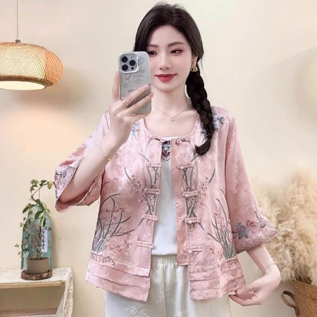 免運 2026夏季新款新中式襯衫女民族風復古七分袖緞面提花刺繡開衫上衣