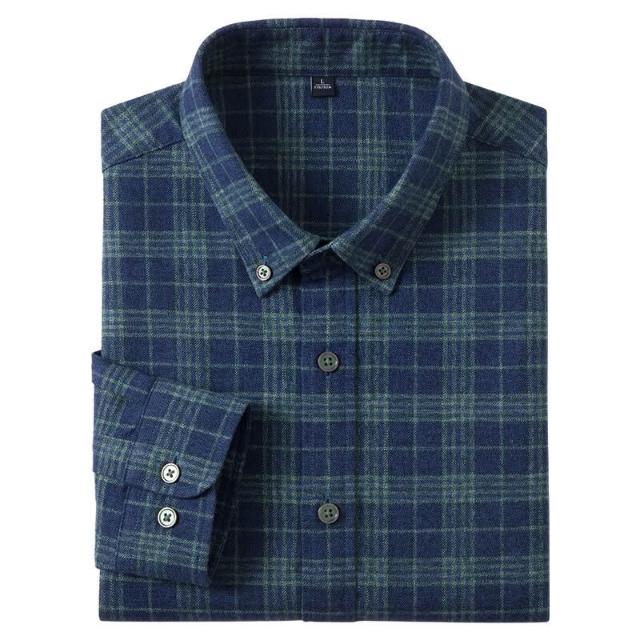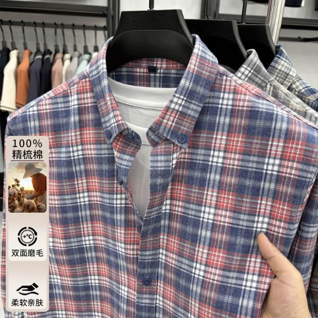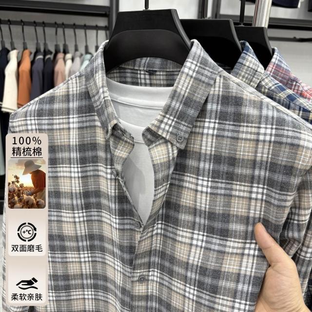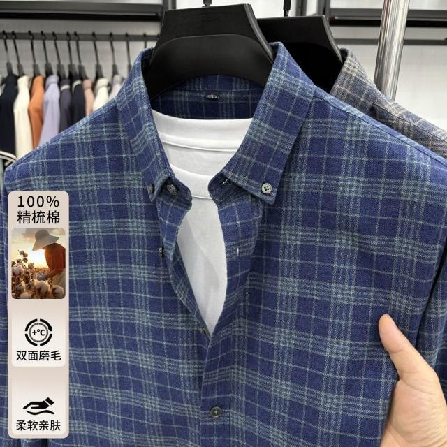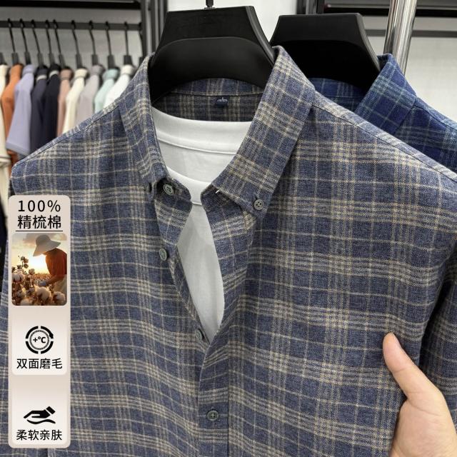 免運 新款秋冬季純棉磨毛格紋男士襯衫藍色格子高級感休閑保暖男式襯衣
