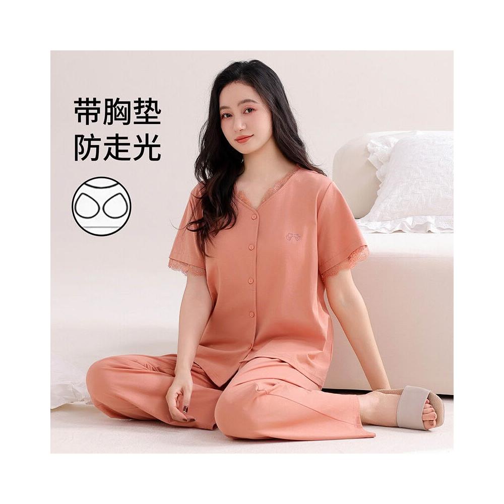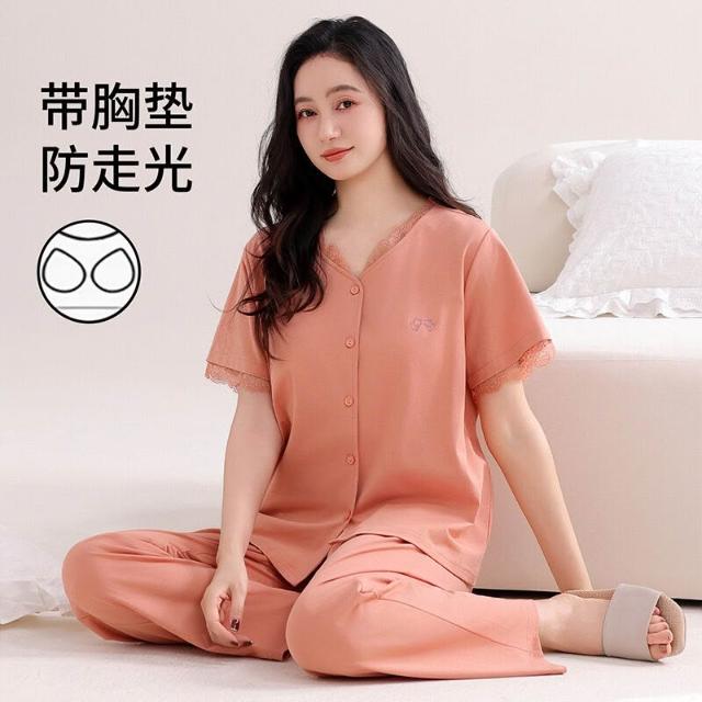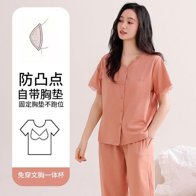 免運 帶胸墊睡衣女夏季莫代爾短袖長褲夏天薄款中年媽媽冰絲夏款家居服