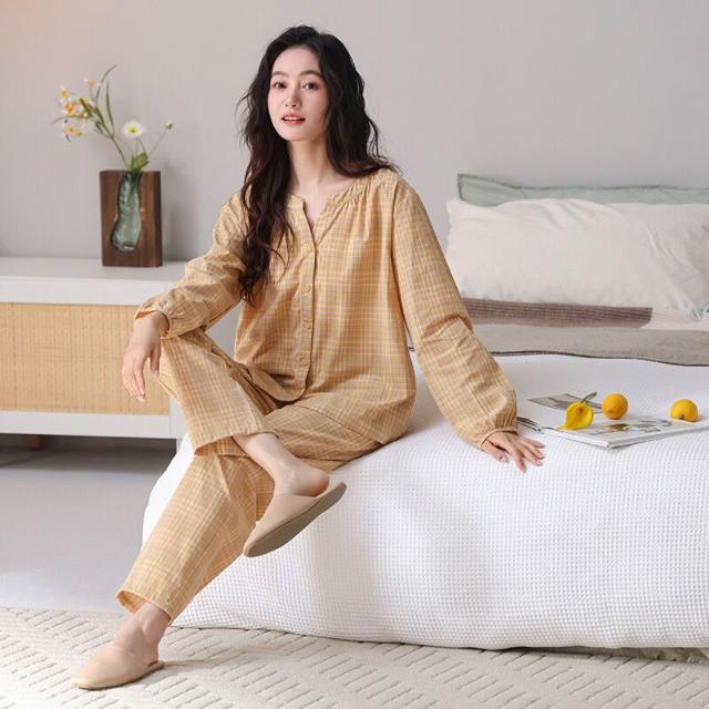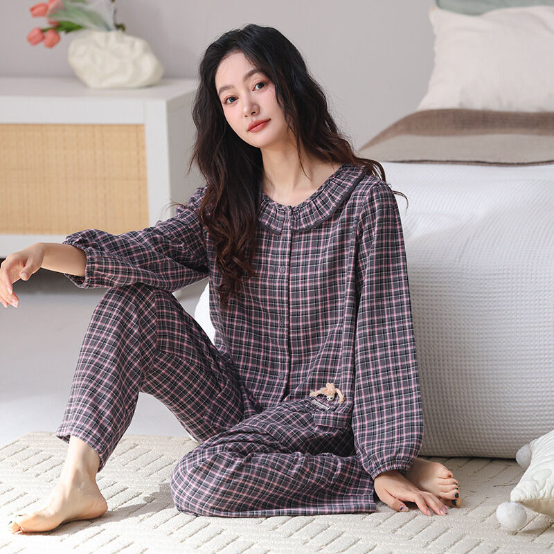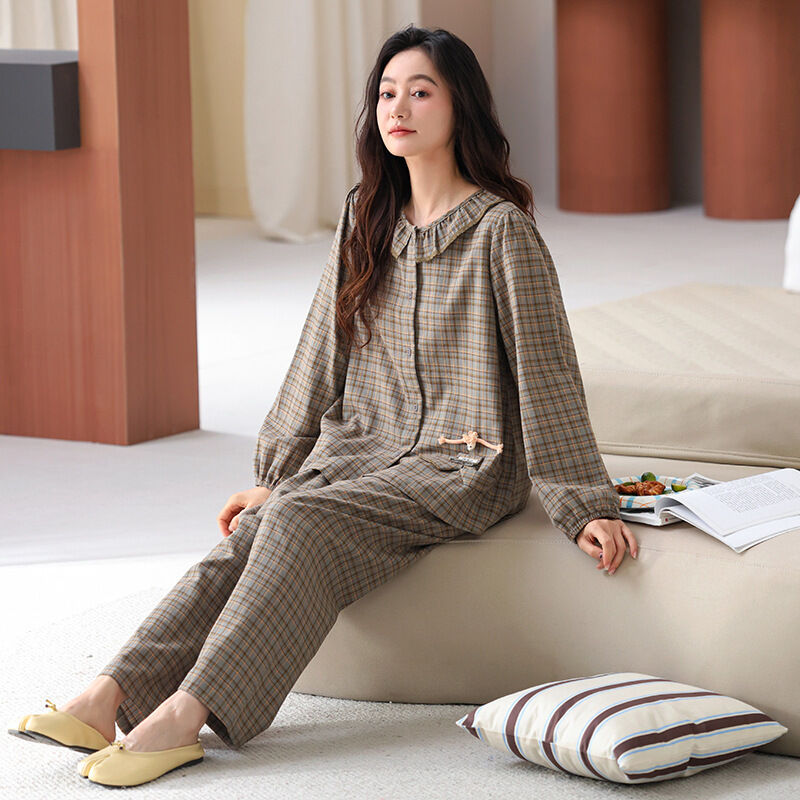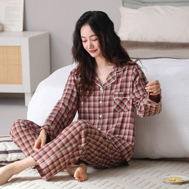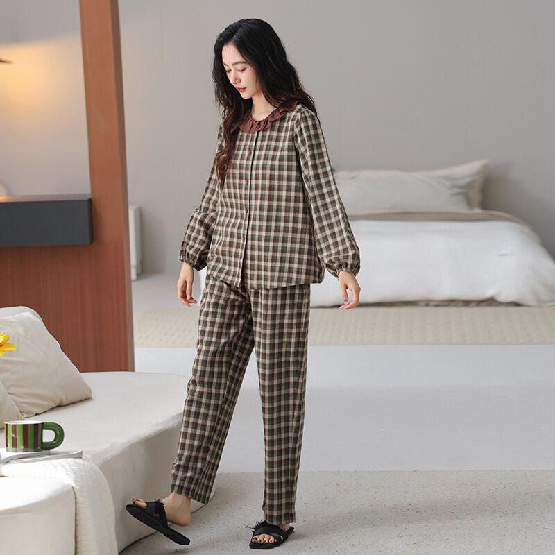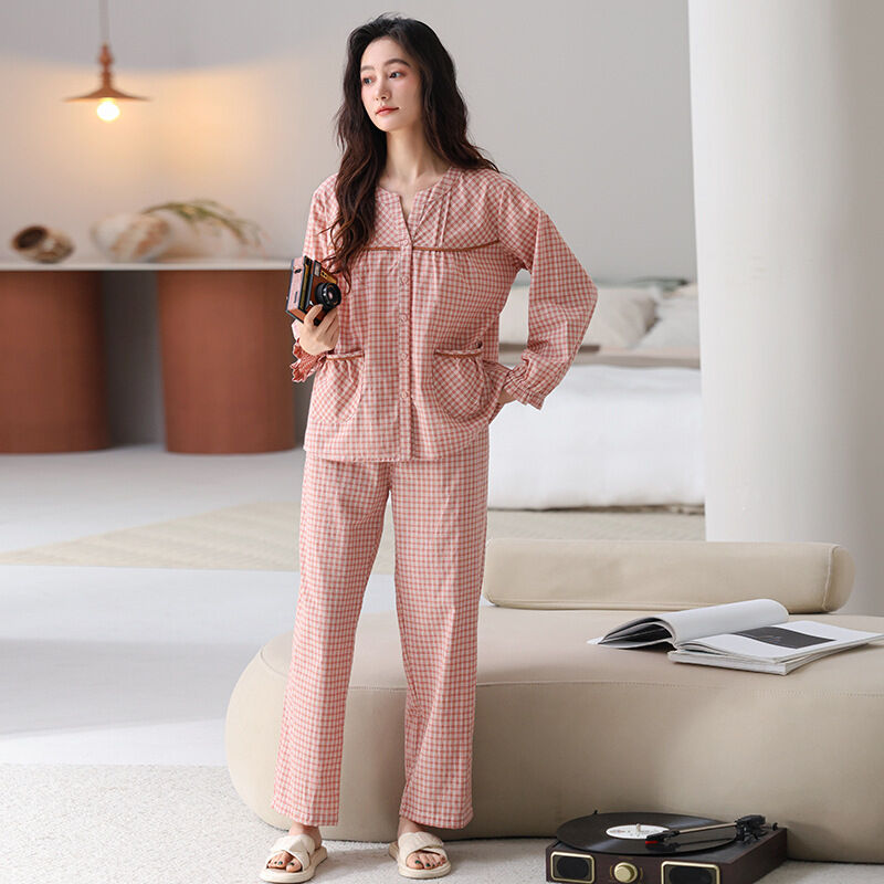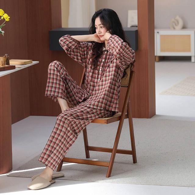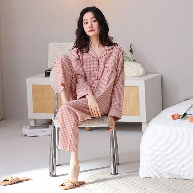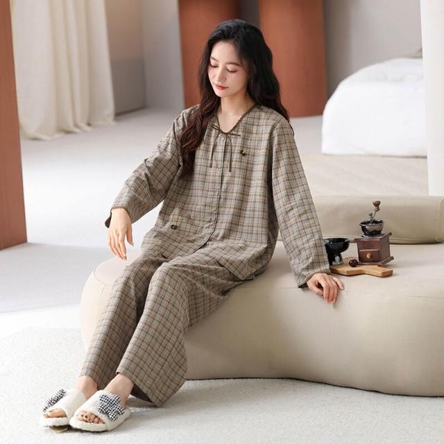 免運 2026秋冬季睡衣女士開衫純棉梭織格子外穿長袖長褲全棉少女家居服