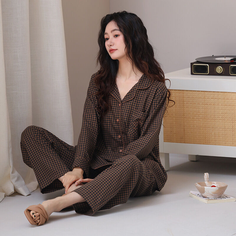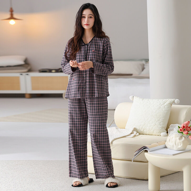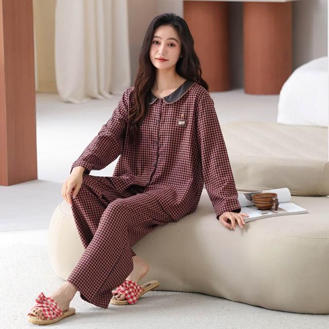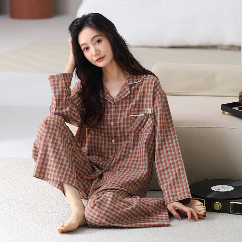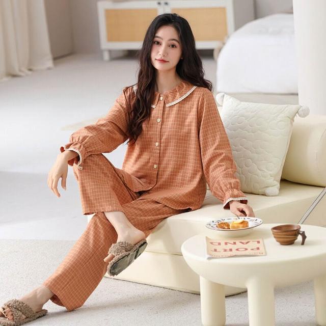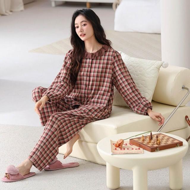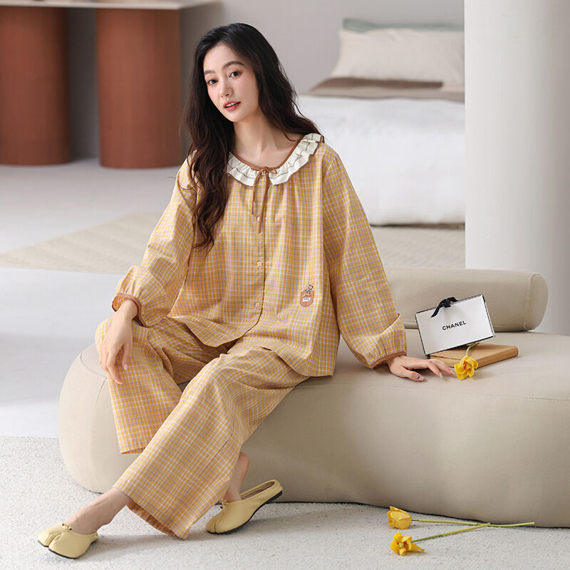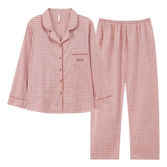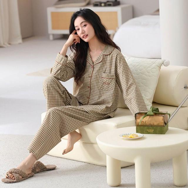 免運 2026秋冬季睡衣女士開衫純棉梭織格子外穿長袖長褲全棉少女家居服