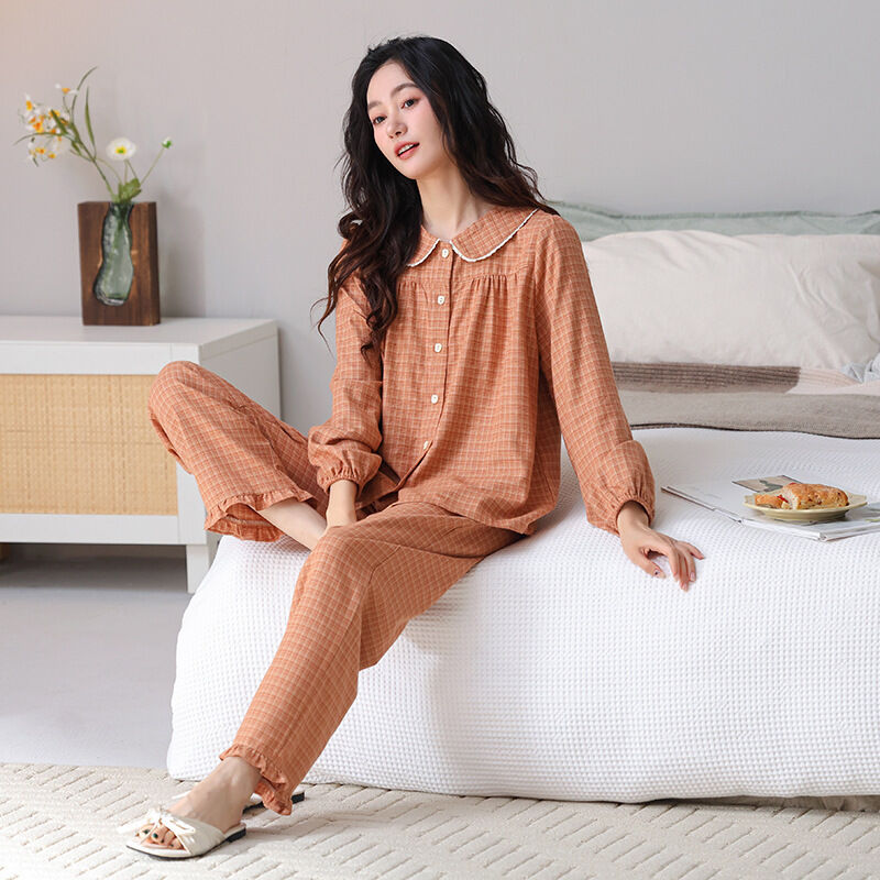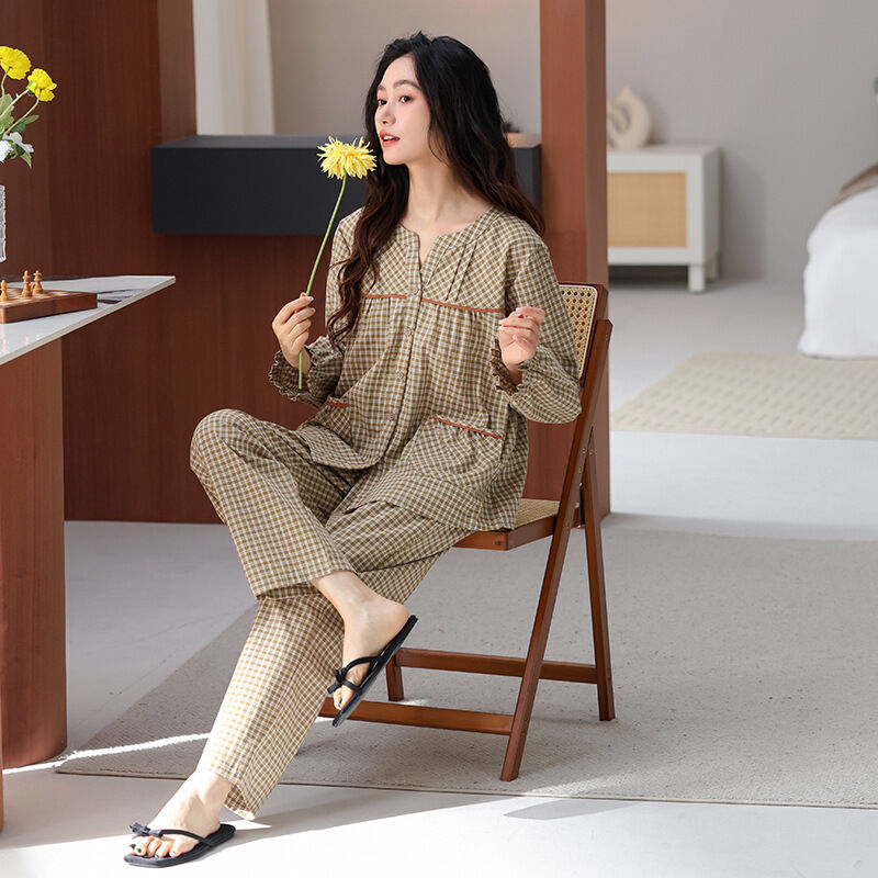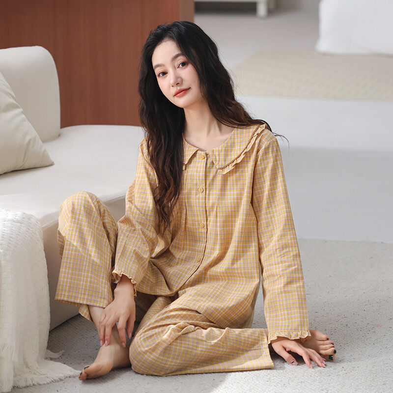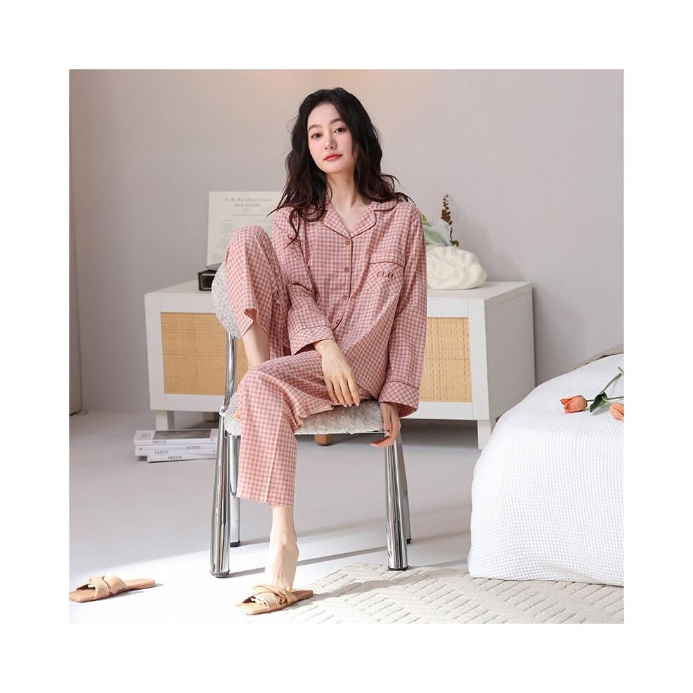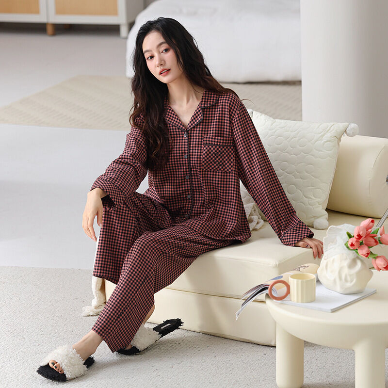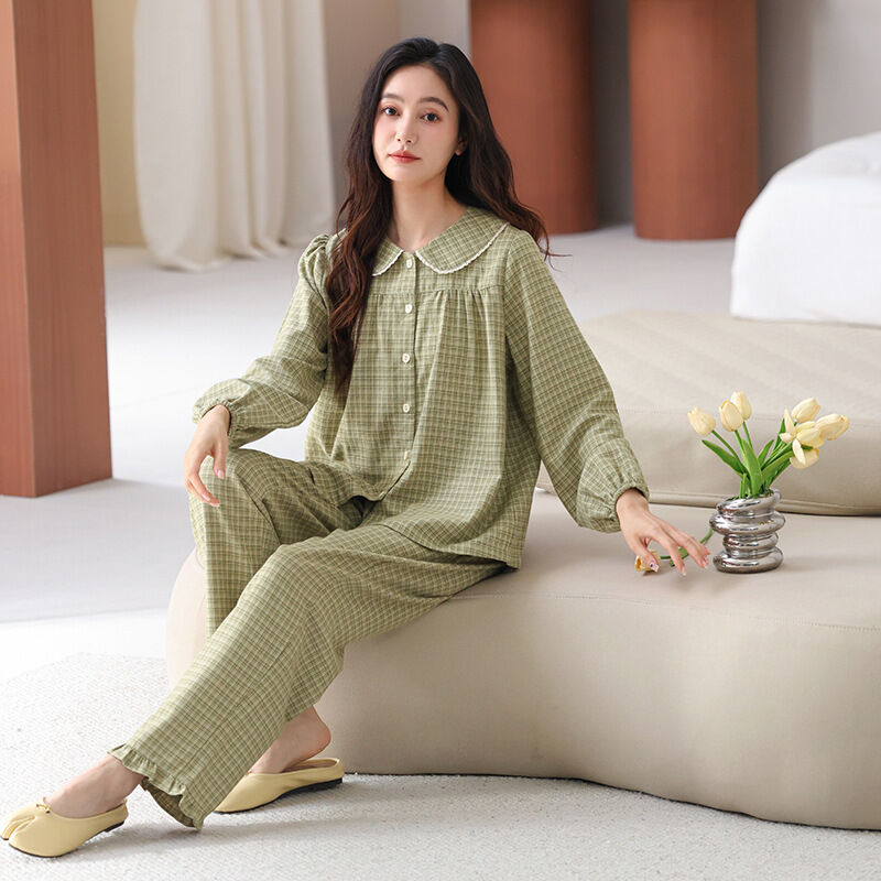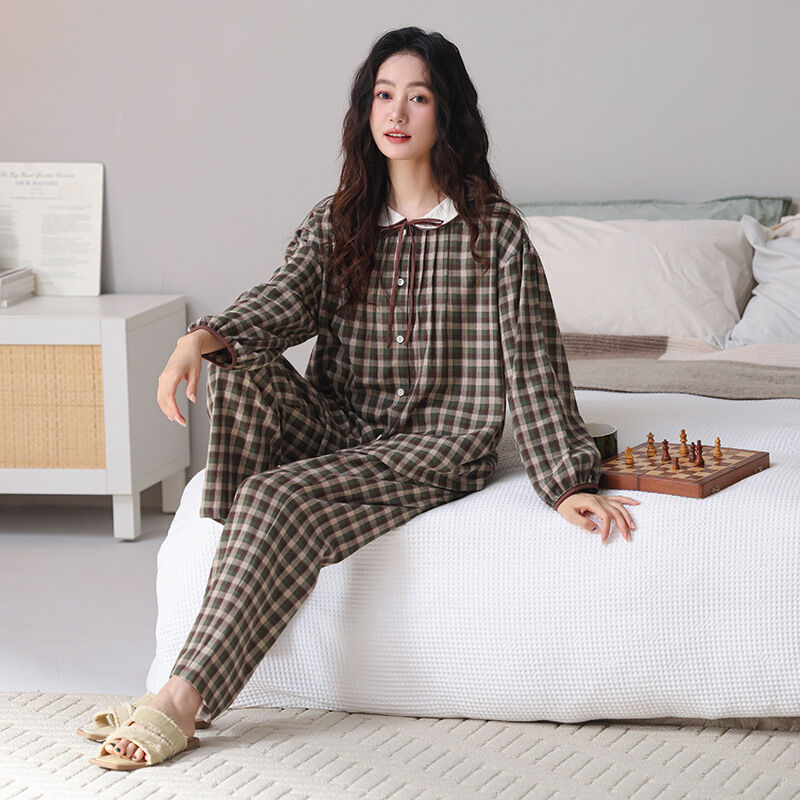 免運 2026秋冬季睡衣女士開衫純棉梭織格子外穿長袖長褲全棉少女家居服