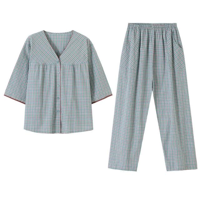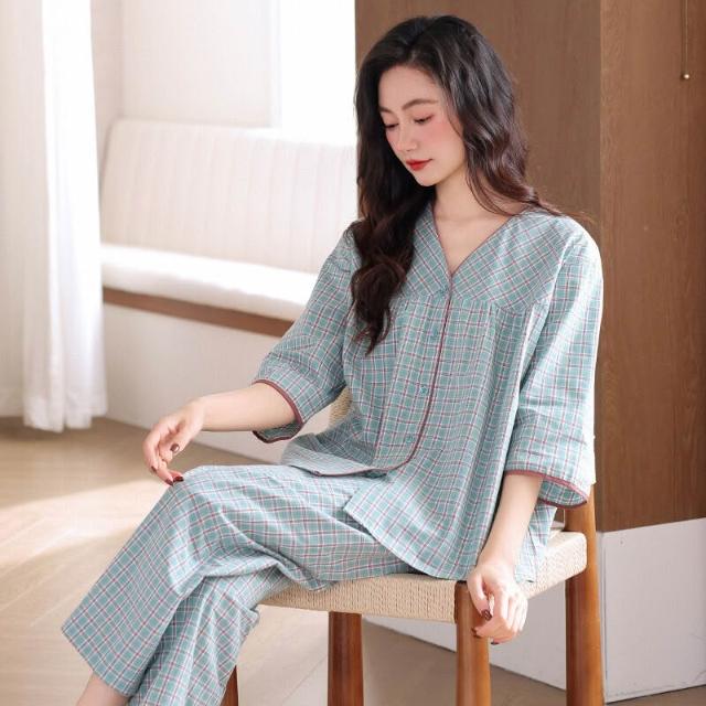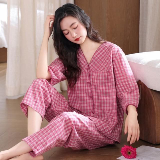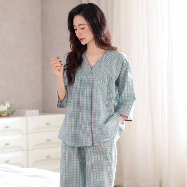 免運 梭織棉紗布睡衣女士春秋款純棉七分袖秋季全棉中年媽媽夏季家居服