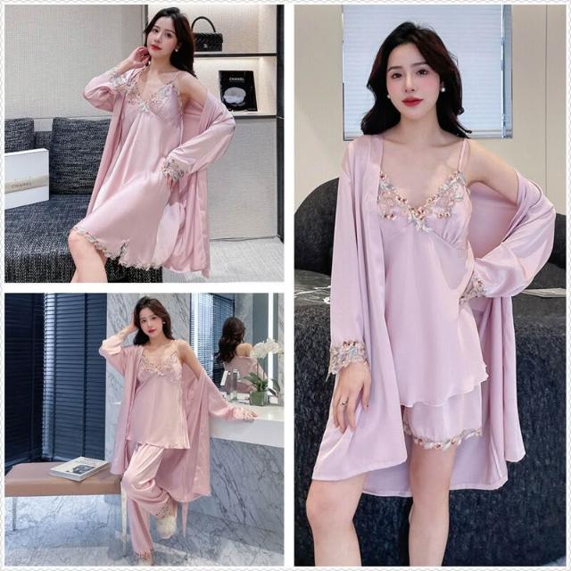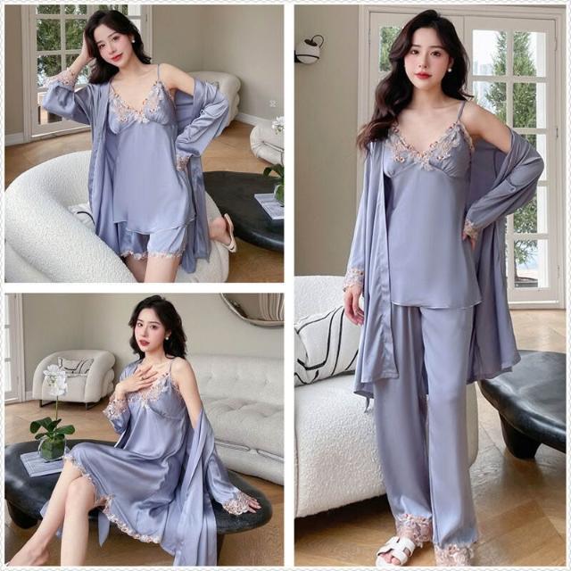 免運 2026新款冰絲睡衣女性感蕾絲吊帶睡袍五件套大碼家居服