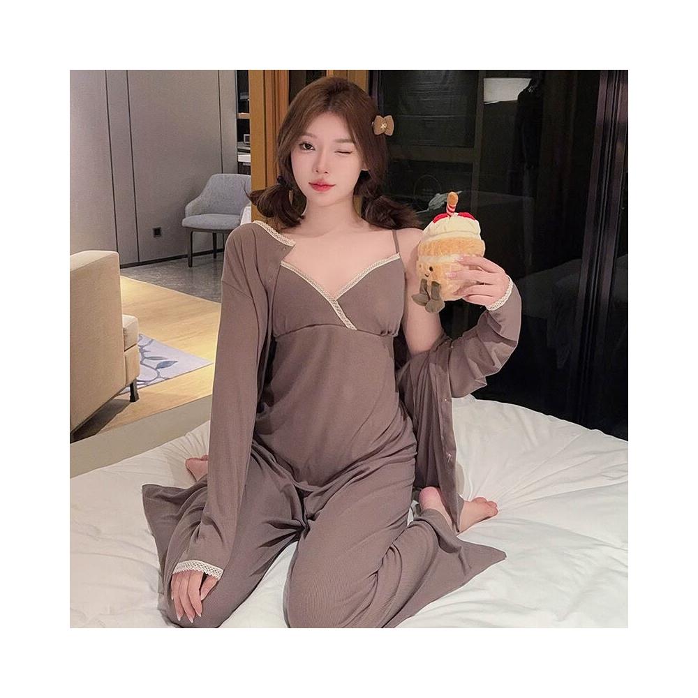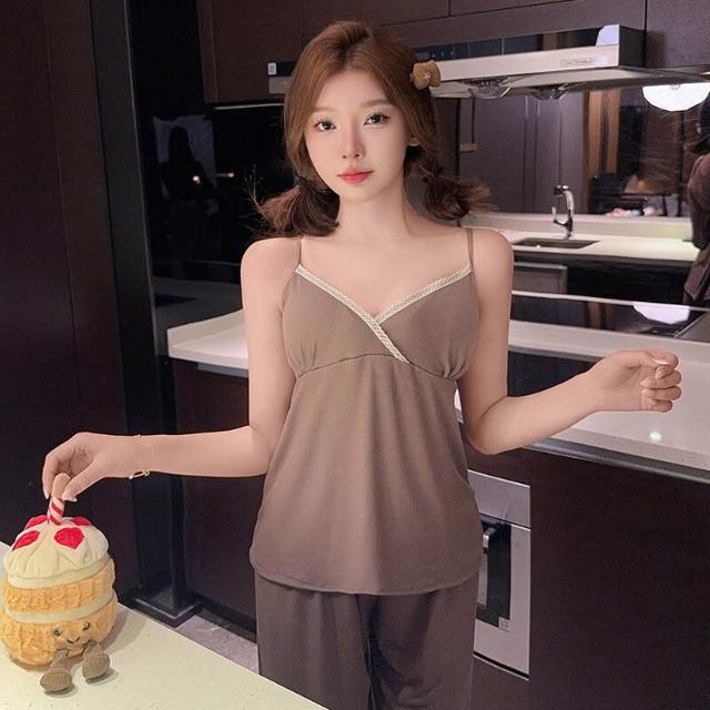 免運 春秋季睡衣女款莫代爾帶胸墊吊帶性感純欲蕾絲家居服三件套