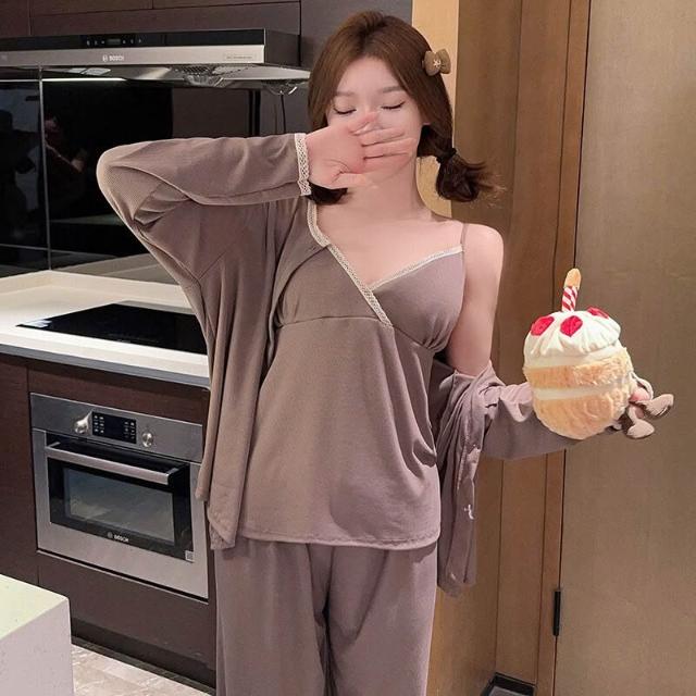 免運 春秋季睡衣女款莫代爾帶胸墊吊帶性感純欲蕾絲家居服三件套