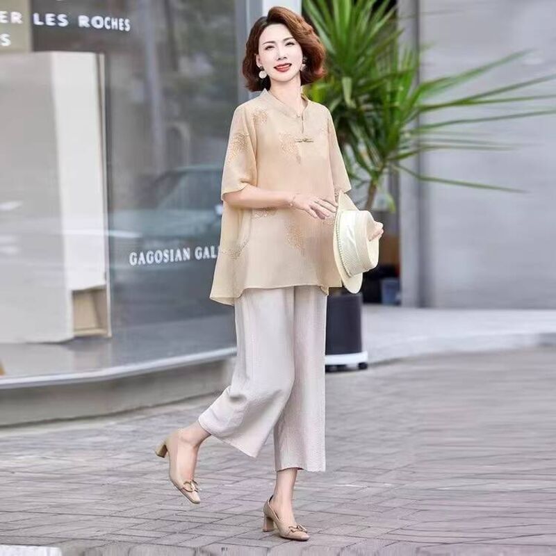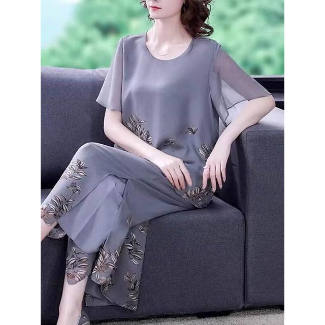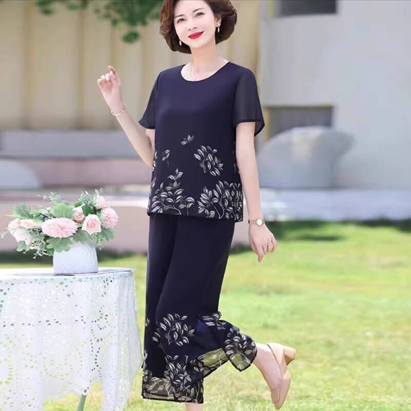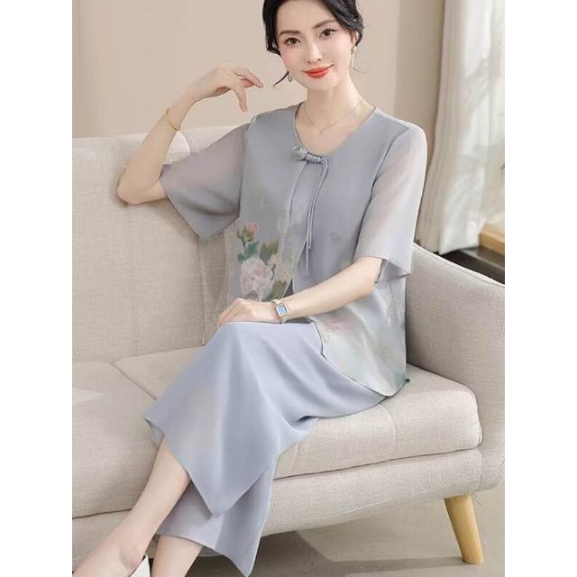 免運 媽媽夏裝套裝年輕婦女大碼上衣服中老年洋氣短袖40歲50雪紡t恤衫