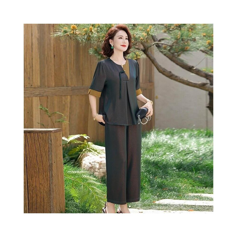 免運 媽媽夏裝新款國風拼接小衫套裝中老年女裝洋氣盤扣飄帶上衣兩件套