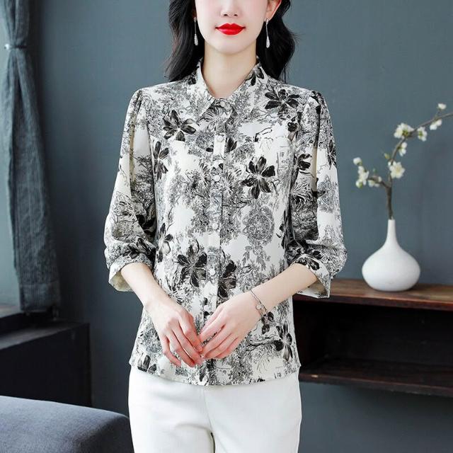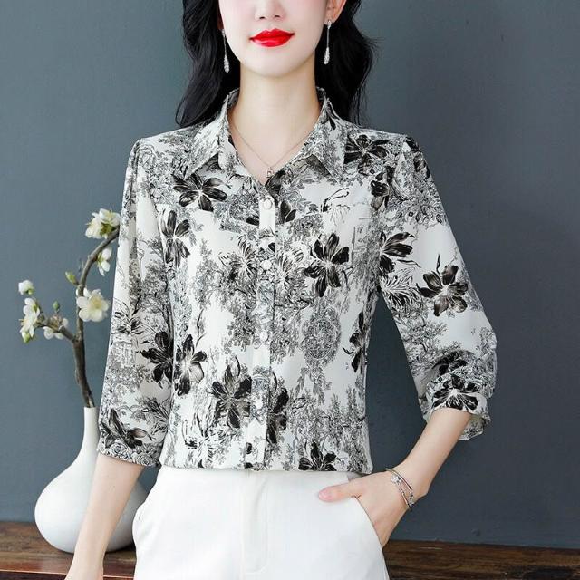 免運 印花桑蠶絲雪紡襯衫女上衣2026夏新款中年印花氣質顯瘦襯衣七分袖