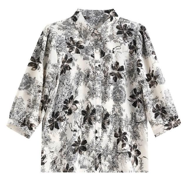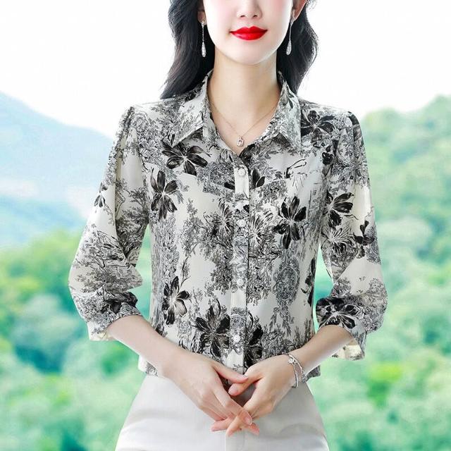 免運 印花桑蠶絲雪紡襯衫女上衣2026夏新款中年印花氣質顯瘦襯衣七分袖