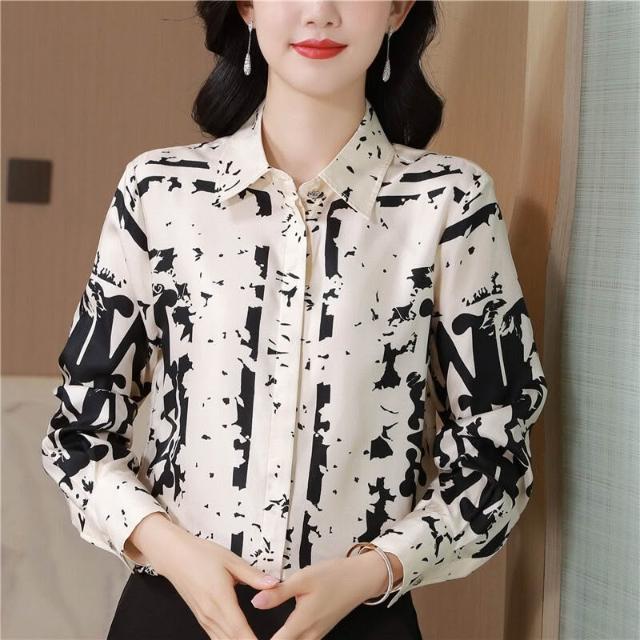 免運 桑蠶絲長袖襯衫洋氣印花上衣中年女士時尚翻領真絲襯衣女